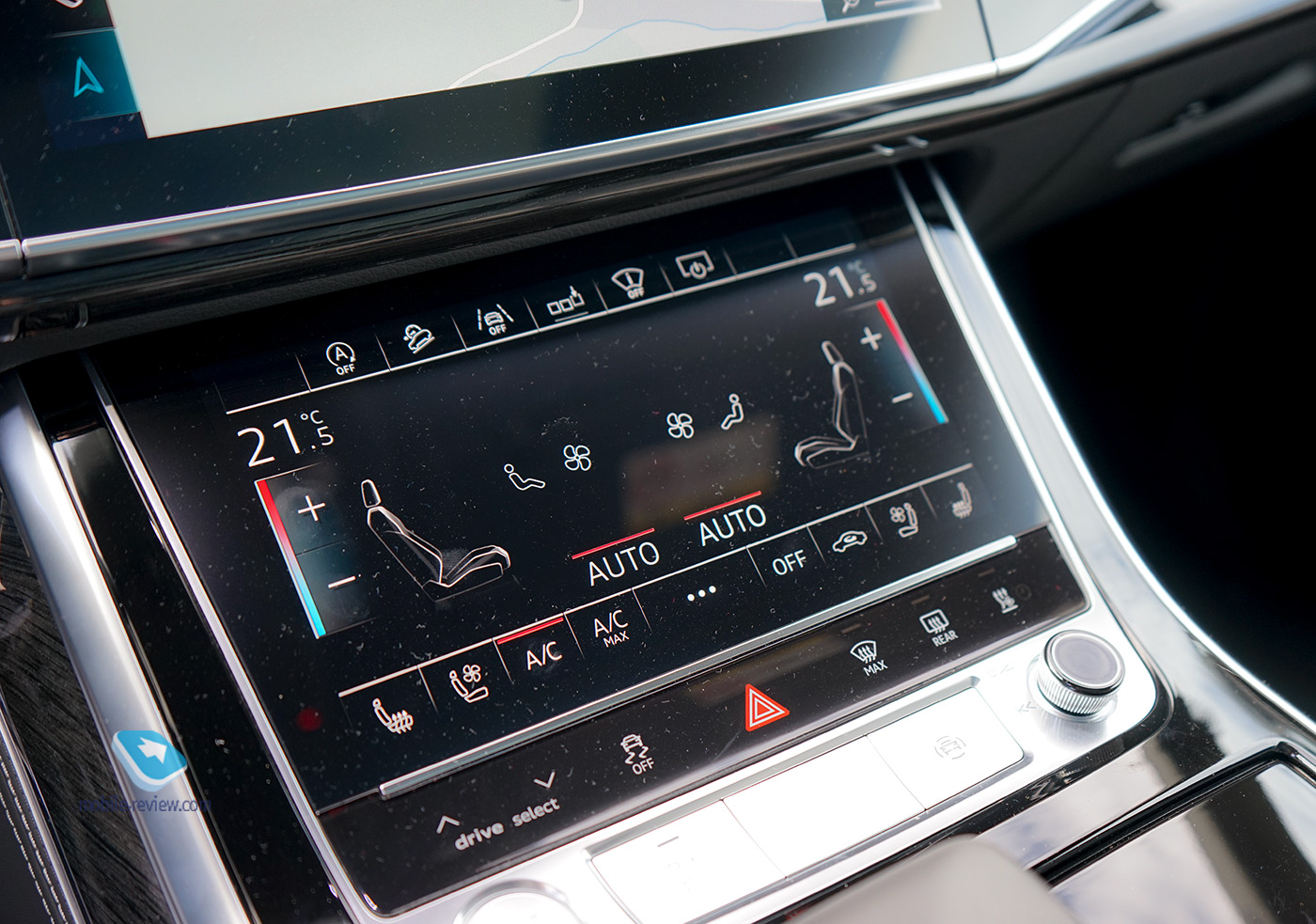 Управление климат-контролем для водителя и переднего пассажира находится на 8.6” сенсорном экране. Температуру можно менять нажатием или же простым свайпом вверх или вниз по шкале, вентиляция, обогрев сидений и другие опции имеют выделенные иконки и включаются/выключаются простыми нажатиями. Есть и не самые очевидные настройки, например, кресел, вам надо нажать и удерживать палец на изображении кресел, тогда уже на верхнем экране откроется окно с настройками. В целом, все понятно, но все же классические крутилки и кнопки, как в том же Q7, были удобнее. Кстати, в новом Audi A4 компания вроде оставила прежний блок климат-контроля, что, на мой взгляд, правильно.
