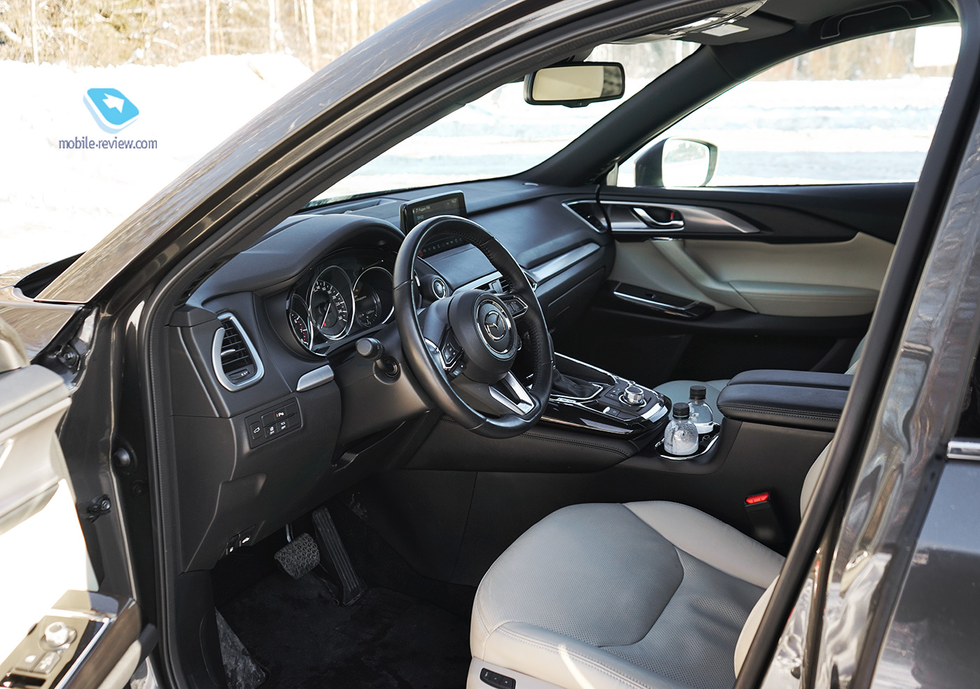 Тест Mazda CX-9Самая большая и самая дорогая модель японского автопроизводителя на российском рынке, Mazda CX-9 – это семиместный полноразмерный кроссовер, цена которого начинается от 2 795 000 рублей. На момент теста у нас была самая топовая версия автомобиля Exclusive, которая стоит 3 149 000 рублей. Основной рынок сбыта Mazda CX-9 – это США, где любимы и востребованы полноразмерные кроссоверы. По некоторым вещам можно легко определить, что автомобиль создавался именно с прицелом на американский рынок. Например, здесь нет системы старт-стоп, салон визуально смотрится дорого, но на ощупь понимаешь, что материалы некоторых элементов оформления только выглядят таковыми. Здесь большие подстаканники и ниши в дверях, в которые влезет полуторалитровая бутылка воды, плюс широкие кресла водителя и пассажира, а также третий ряд сидений.