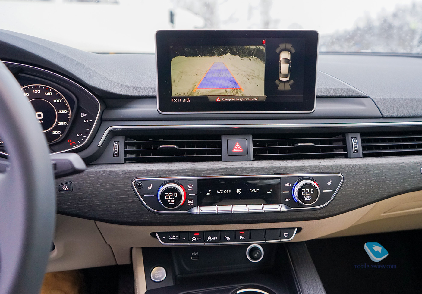 Головная система тестового автомобиля MMI Navigation plus с MMI touch оснащена IPS дисплеем диагональю 8.3 дюйма. Дисплей не сенсорный, так что все управление осуществляется шайбой и клавишами. Система поддерживает работу с Android Auto и Apple CarPlay, два USB-порта находятся в переднем подлокотнике. По скорости работы системы никаких нареканий нет, некоторые говорят, что MMI запутанная и сложная в освоении, но, на мой взгляд, она вполне понятная, просто требует изучения на первых порах, как и всякий новый интерфейс. Также в нашем автомобиле был установлен 4G модем, который позволяет системе получать информацию из сети, дополняя данные встроенной навигации, а также дает возможность отображать погоду и новости. Система MMI вполне сравнима по удобству, возможностям и скорости работы с системой BMW NBT, она удобнее и быстрее системы в Jaguar XE и, конечно, на голову превосходит систему inTouch в Infiniti Q50.