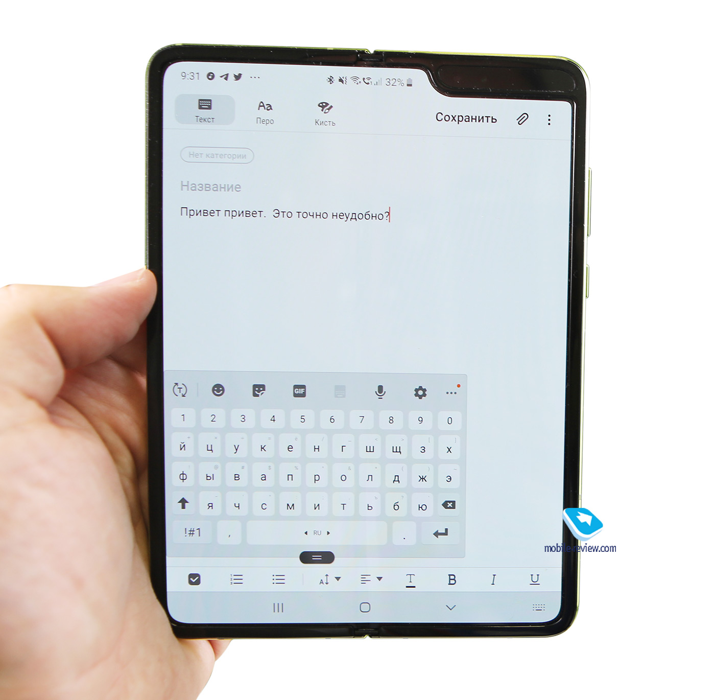 Со стороны ложбинка на Fold выглядит как излом, свет всегда играет на ней, и кажется, что экран сломан. В то же время, когда вы смотрите на экран, держа его в руках, у вас нет даже малейшего ощущения, что там есть искривление, все отлично. Пальцы ощущают ложбинку, поэтому клавиатуру разорвали внешне на две части, чтобы не задевать середину экрана. Это убирает такую опцию, как непрерывный ввод, когда вы водите пальцем по клавиатуре, чтобы набрать слово. Сама опция, конечно же, есть, но пользоваться ей не очень удобно, если только клавиатуру не уменьшить до одной половины дисплея.