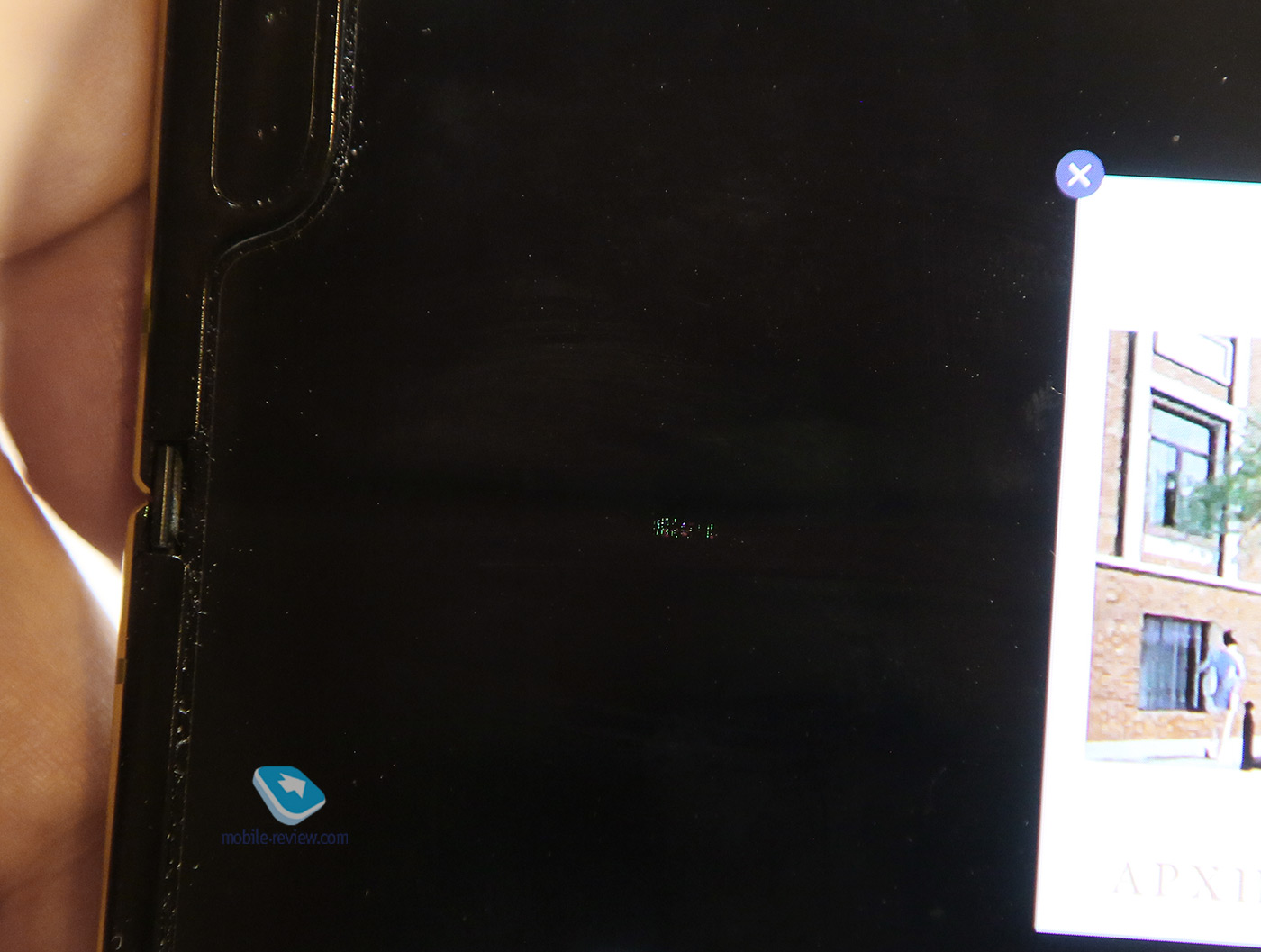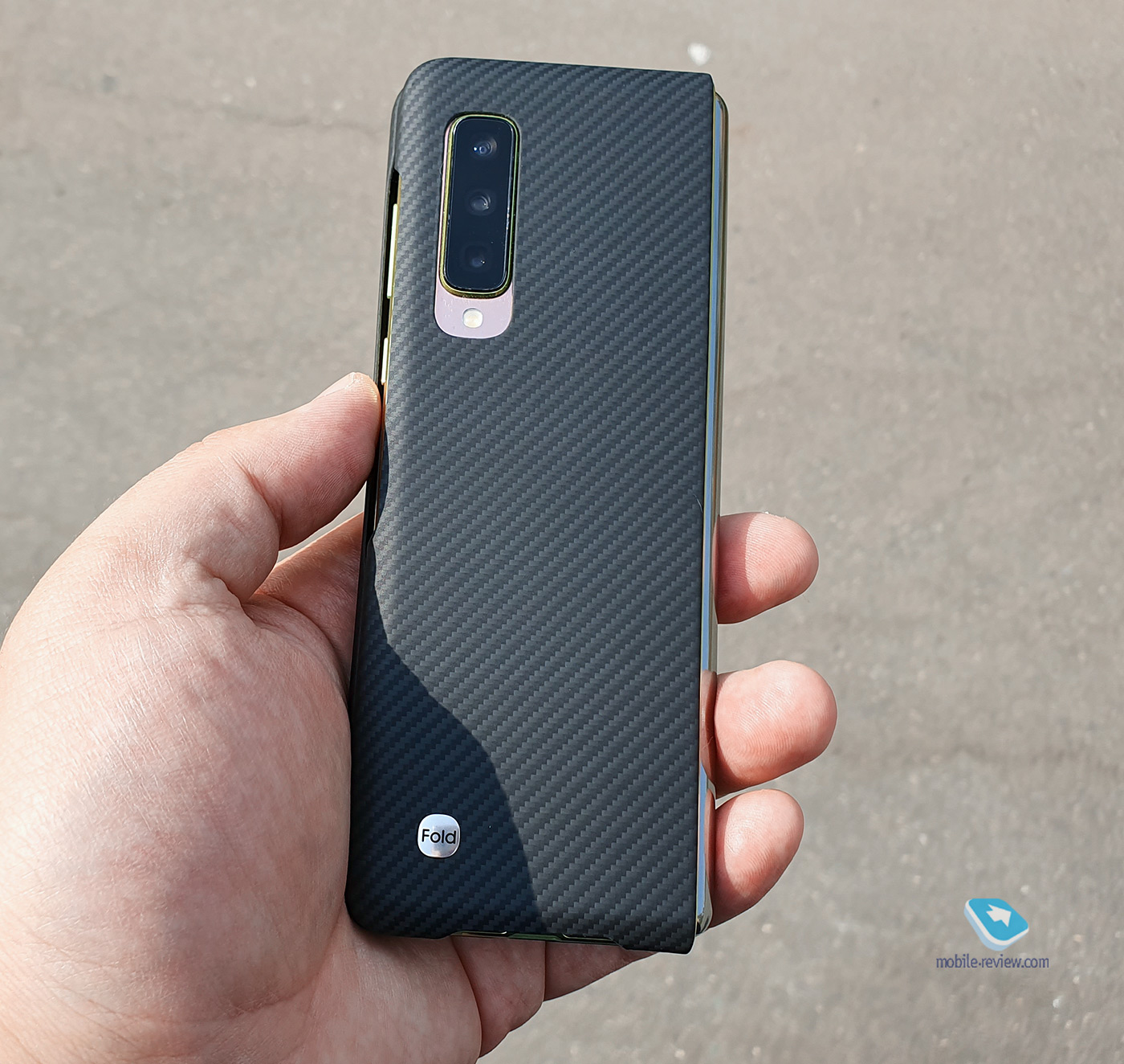 Тем не менее, надо понимать, что матрица ничем, кроме слоя графеновой пленки, не защищена. С графеновой пленкой еще одна забавная история, поколение Wiki не может осознать, как создаются материалы, и ему кажется, что графен – это один слой атомов и, соответственно, никакая пленка существовать не может. Намекаю, что у этого поколения есть еще и Google, можно почитать, что такое графеновая бумага, и подумать, как материал может использоваться в продукте и почему один слой атомов – это далеко не предел. То, что в Samsung показывали испытания дисплея на 200 000 открытий/закрытий, реальность с таким материалом. Также мелкие потертости на экране не появляются, во всяком случае, мой S10+ приобрел их за несколько недель, тут этого не случилось. Но проблема в том, что сам экран вовсе не из графена, это только защитная пленка. При ударе или сильном нажатии каким-то предметом дисплей частично выйдет из строя, вы продавите его. В инструкции напрямую сказано, что носить Fold с мелкими предметами, которые могут попасть между створок, не нужно (равно как и сказано, что не надо отрывать “пленку” или, напротив, клеить защитный слой). У меня случилось так, что бросил Fold в сумку, где оказался конверт с новыми банковскими картами, он попал между половинками, и в какой-то момент произошло сдавливание – конверт давил на экран. И вот что вышло – вы видите на сгибе выбитые пиксели. Это механическое повреждение, и это слабое место для всех без исключения гибких экранов. Поэтому мне не нравятся модели, в которых гибкий экран одновременно является и внешним, вероятность повредить его возрастает многократно. Тут она также присутствует, но то, что это раскладушка, в которой основной дисплей спрятан внутри, делает шансы его повредить меньше. Ждать того, что дисплей на сто процентов защищен от внешних повреждений, – это утопия. Именно по этой причине в раскрытом состоянии аппарат предлагает работу во время разговора в режиме громкой связи. Чтобы женщины своими сережками с бриллиантами не продавливали экран или не царапали его. Чехол для Galaxy Fold – нужная вещь или баловство?В комплекте с Fold идет карбоновый чехол, точнее, это две половинки, которые можно наклеить на смартфон.