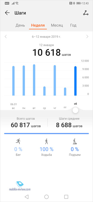 Тем не менее, Band 3 Pro я сверял по нескольким тонометрам и вручную. В первом случае расхождений почти не было, а во втором погрешность была в 2-3 удара. Браслет считает пульс в течение 47 секунд, поэтому результат максимально точный. Если включен замер в течение всего дня, то замер частоты пульса происходит постоянно, но в приложении на графике вы этого не заметите: там показана «картина» в общем, и отследить можно грубо с отсечением 2-5 минут. Лично мне такого анализа вполне хватает.