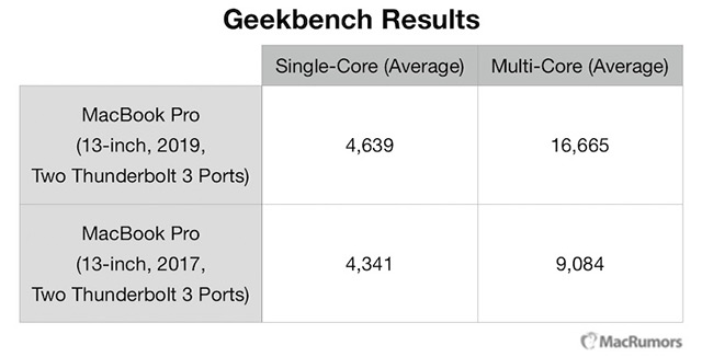 С базовым MacBook Pro 13 все несколько интереснее. В позитивном ключе можно отметить действительно сильно возросшую производительность, а также незначительно увеличенную батарею. Коллеги из MacRumors уже успели протестировать новую «прошку» в Geekbench, и там она показала 4 639 (против 4 341) очков в одноядерном и 16 655 (против 9 084) в многоядерном режиме. То есть прирост на 83%, что очень даже неплохо, пусть и не в два раза, как об этом заявляет Apple.