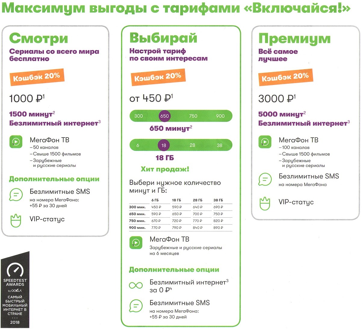 «МегаФон», новая тарифная линейка «Включайся»Как и было анонсировано, 11 марта 2019 года вышла обновлённая линейка пакетных тарифов. Из самых интересных новинок — появившийся тариф «Выбирай» с гибкой настройкой пакетов минут и гигабайт трафика. Также широко рекламируется кэшбэк 20% на всех «Включайся!», это заявлено чуть ли не как «killer feature» новых тарифов линейки. Предварительный обзор новой линейки «МегаФона» написал Эльдар, почитать можно здесь. Много интересного об истории тарифов «Включайся!», позиционирование линейки на рынке, доработки тарифов в соответствии с потребностями пользователей и многое другое. А в этом обзоре мы с вами больше сосредоточимся на скучной конкретике и тарифных особенностях. Поехали! Саму новость можно почитать здесь, цитаты: