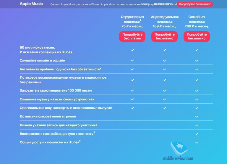 Во-вторых, у сервиса неплохое ценообразование. Индивидуальная подписка стоит 169 руб./мес., но с помощью семейного тарифа (до шести человек) за 269 руб. в пересчете на одного человека получается 45 руб. Для создания «семьи» справки о родстве предоставлять не надо, это позволяет экономить не только родным, но и просто друзьям. Студентам доступен льготный тариф – 75 руб./мес. вместе с подпиской на видеосервис Apple TV+.