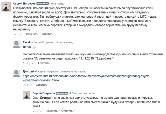 Если совсем в двух словах, то будут брать 2 рубля в сутки (в среднем 61 в месяц) за комплексную услугу, компоненты которой можно было получить бесплатно. Радостного в новости мало, подробное описание «нового» сервиса здесь. Некоторый позитив в том, что теперь не нужно будет метаться по всему сайту в поисках отдельных компонентов, вся информация собрана в одном месте. Ещё позитивом можно считать то, что для действующих абонентов ничего не меняется, принудительно нанимать «секретаря» не принуждают. Основной негатив в том, что становится невозможным отключение только одного, не устраивающего вас компонента. Или отключать всё оптом, или оставлять подключенным весь пакет и платить за него. Например, информирование звонившего о том, что вы появились в сети, нравится далеко не всем, но теперь с этим ничего нельзя поделать, если нужна конференц-связь. Мне кажется, что здесь маркетологи недоработали, нужно было добавить в пакет и АОН. Вот тогда от пакета точно никто бы не отказался, и платили бы все как миленькие, можно было бы и 3 рубля в сутки сделать. Ещё «в тему» пакетов. На днях позвонили мне из «Билайн», предложили пакет из домашнего интернета плюс тариф с безлимитным мобильным интернетом за 345 руб. Для Москвы — отличная цена, и кабель «Билайн» в дом уже проведён, но ребята из МГТС подсуетились чуть раньше, «Билайн» со своим предложением опоздал буквально на три недели или даже меньше. Бывает, но ладно, как-нибудь переживу. Интернет от МГТС пока всех домашних устраивает, а я очень не люблю трогать то, что нормально работает. МТС, найди то, не знаю чтоИ не знаю где. Не иначе как знаменитый искусственный интеллект задействовали, так как просто человеку такое бы в голову не пришло. 18 ноября я писал о грядущем подорожании в МТС роуминга по России — да-да, того самого, который давно «отменили», почитать можно здесь. Оказывается, изменения вступили в силу уже 19 ноября и новость была честно опубликована как положено, на сайте МТС. Но КАК опубликована! Это просто песня.