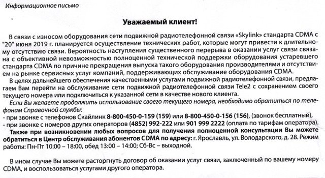 Посмотрел на стоимость заказа детализации в салонах «МегаФона» (50 руб. за каждые сутки), чуть не прослезился от умиления. Например, в салонах МТС берут за каждые сутки детализации по 3 руб. Хотя там тоже свои «маленькие хитрости», минимальный период заказа — 30 суток и меньше 90 руб. всё равно не заплатишь. Но тут хорошо откомментировал коллега: «Ну и правильно сделали! Единицам нужны детализации за пару дней для судов и прочего официоза. Авось, не разорятся. Ещё некоторые приходят с адекватными вопросами, таким всегда всё покажут/объяснят по истории баланса и не поленятся бесплатно отправить детальку на email. Но ведь большинство приходит поговорить «за жисть», потратить дорогое время сотрудника и вынести мозг вопросом об «украденных» с баланса трёх рублях два месяца назад, заградительные цены ставят для них». Коллега знает о чём говорит и, наверное, он прав. В любом случае, обслуживание живым человеком обходится компании недёшево и желание переложить хотя бы маленькую часть затрат на клиента вполне объяснимо. И всё-таки главное - «отучить» большинство клиентов от посещений салонов на предмет «а поговорить?», для оператора это в итоге намного выгоднее, чем получать микроскопическую прибыль от продажи детализаций. «Скайлинк» в стандарте CDMA – всё?Интересное информационное письмо выложили почитать (см. ниже), в данном случае речь идёт о Ярославской губернии. С 20 июня сегмент сети в CDMA 450 отключают на время «проведения технических работ», оставшимся абонентам предложили подключиться к сети Tele2 с сохранением своего номера.