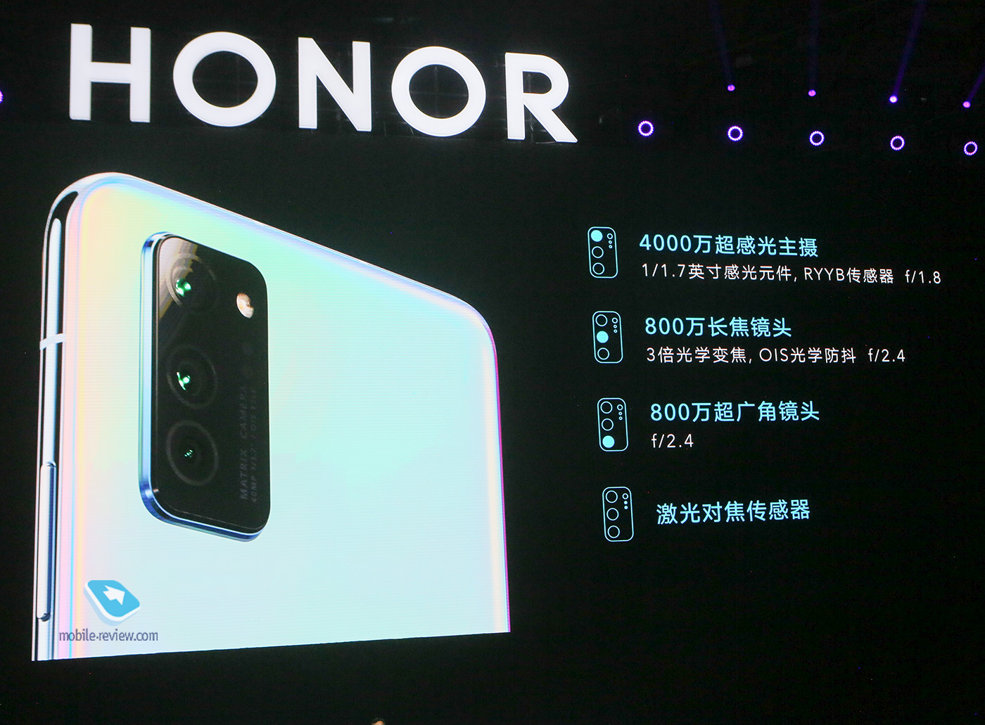 Обзор Honor V30 сделаю отдельно, тут же хочу немного остановиться на презентации, так как она не менее важна и показывает, на что производитель делает упор, особенно на родном рынке. Построение презентации классическое, вначале показали различные цветовые решения аппарата, ведь цвета – это важно.