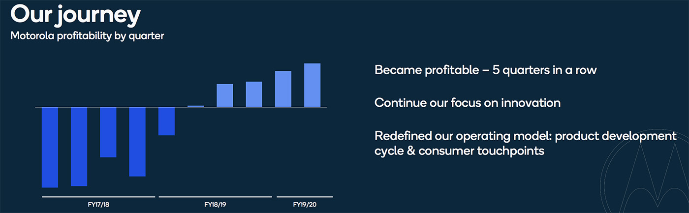 При этом в 2020 году компания планирует представить более 10 смартфонов с поддержкой 5G. Даже если предположить, что в это число входят разные вариации одинаковых моделей, то можно говорить, что это не только флагманы. А значит, мы увидим как модели на 865-ом чипсете, так и большее число на 765-ом. Это отображение стратегии Qualcomm на практике, разные модели в разных ценовых группах. У Motorola отличные новости, уже пять кварталов подряд компания приносит прибыль. И это случилось впервые за много лет, их стратегия работает.