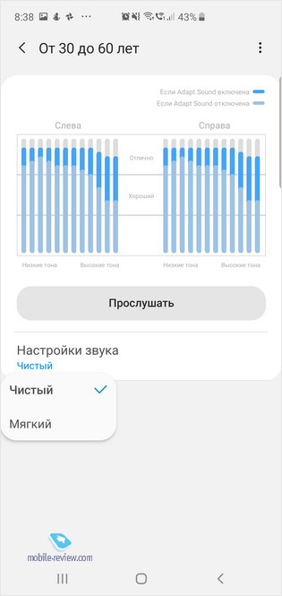 Но то, что действительно необычно и важно, это настройка звукового профиля в зависимости от вашего возраста. Функция Adapt Sound создает звуковой профиль для звука во время разговоров, прослушивания музыки или просмотра видео. Вы можете выбрать также дополнительную настройку – чистое или мягкое звучание. За простой настройкой, скрытой в меню, – годы изучения физиологии человека и его слуха. Вы потратите от силы минуту, чтобы настроить аппарат под себя, но результат того стоит. Единицы знают о такой настройке, но когда человек пробует Samsung Galaxy с этой настройкой, то он пропал – в каждом новом телефоне он первым делом отправляется установить “правильное” звучание. И тут слово “правильное” описывает то, что верно для конкретного человека, то, что ему нравится.