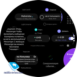 В S Health есть интересная штука, теперь можно соревноваться с друзьями, кто из вас больше пройдет шагов. И на часах есть виджет, который показывает ваш прогресс. Функция S Voice теперь называется Bixby, но, в отличие от смартфонов, поддерживает ввод на русском языке (только ввод, поговорить с ассистентом не выйдет). Качество распознавания текста на уровне Frontier, тут нет никаких отличий.