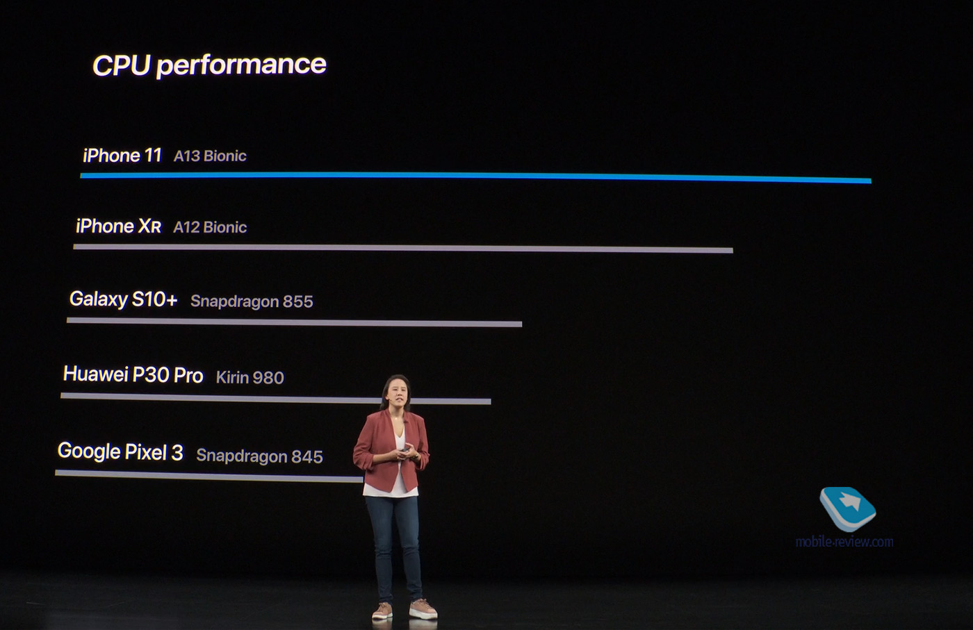 По технической части новые айфоны стали, конечно, интереснее предыдущих, но некоторых обычных для флагманов на Android фишек они не получили. Так, новый iPhone XR, он же iPhone 11, получил вторую широкоугольную камеру, увеличил время автономной работы в сравнении с предшественником, а фронтальная камера научилась снимать замедленное видео. «Прошки» получили третью широкоугольную камеру, новый дисплей Super Retina XDR и, ура-ура, блок питания 18 Вт (для владельцев смартфонов на Android и даже не флагманов это аж смешно) для быстрой зарядки в коробке, ну и, конечно, стали работать дольше предыдущих моделей. Все новинки получили новый процессор A13 Bionic, который, конечно же, мощнее и быстрее своего предшественника, но, что интересно, компания впервые сравнила его напрямую с конкурентами.