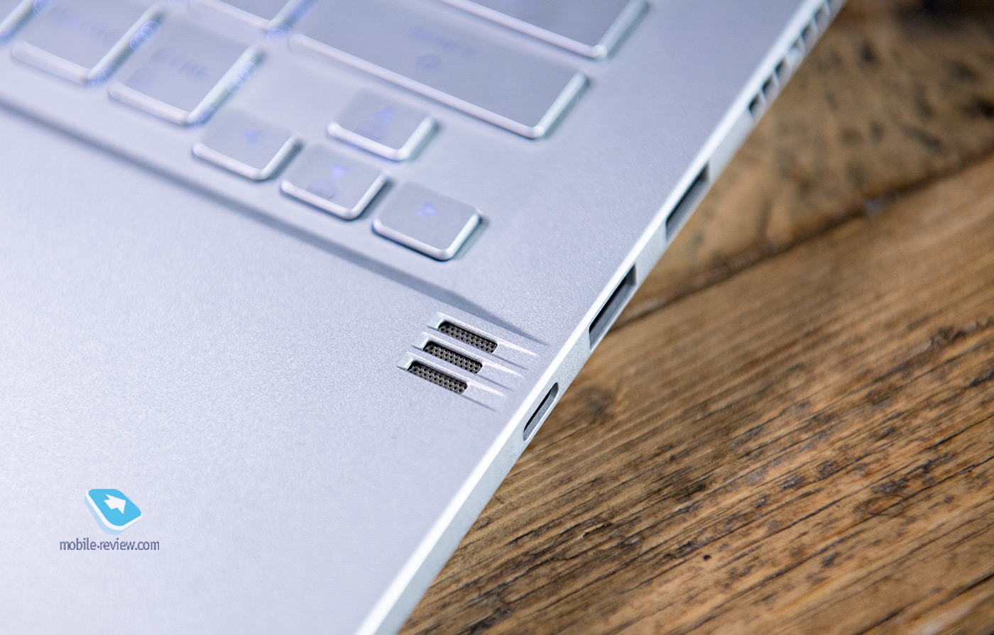 За звук отвечает система из четырёх динамиков. Два высокочастотных динамика расположены слева и справа от клавиатурного блока, а точнее, того места, где находятся руки при наборе текста. Их звук выходит наверх, за басы отвечают два низкочастотных динамика на примыкающей к столу части корпуса. Такое расположение позволяет им резонировать и создавать определённый объём звучания.