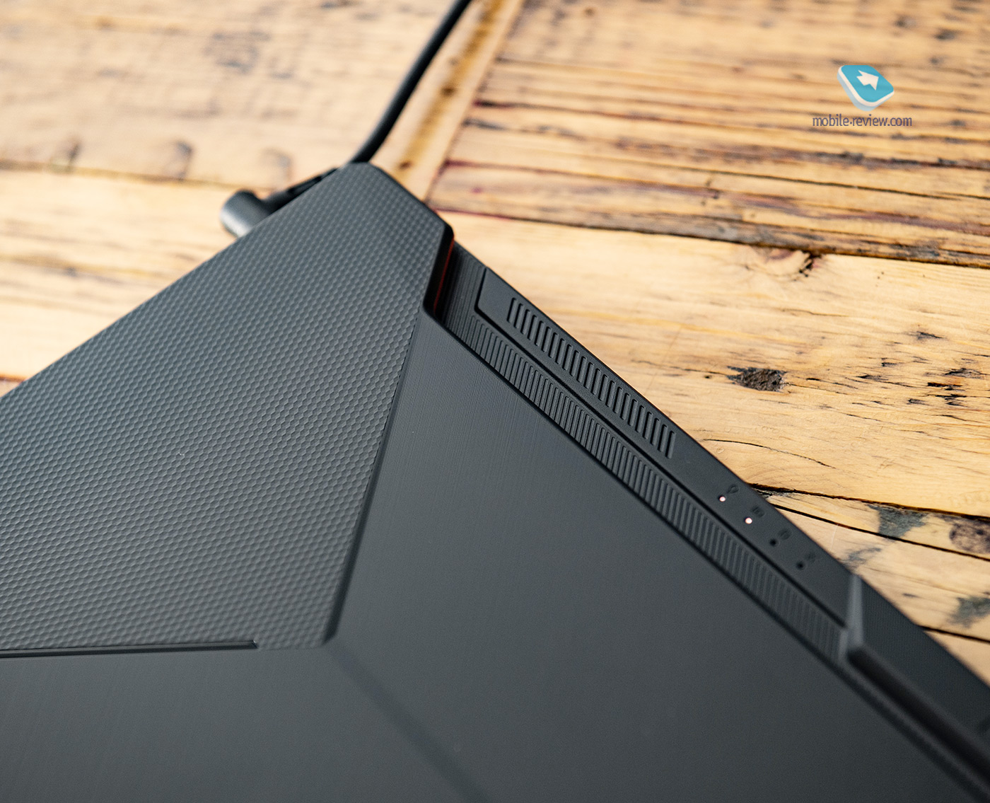 Основной корпус выполнен из шлифованного пластика с текстурой под металл, он очень прочный, ничего не прожимается, очень монолитно и солидно. Над клавиатурой расположены отверстия, из которых выдувается воздух из корпуса, им в помощь предусмотрены аналогичные элементы на левом и правом торце. Чуть выше по центру – светодиодные индикаторы включения, подключения к сети, авиарежима и активности жёсткого диска, они видны и в закрытом состоянии, этому способствует специальный вырез в нижней части крышки. Дизайн и габариты Asus TUF Gaming A15 позволяют с лёгкостью взять его с собой, хоть в гости, хоть в офис, лэптоп запросто помещается в рюкзак. Найдётся место и для блока питания, несмотря на его внушительный вес и размеры. Работать с ноутбуком на коленях удобно, корпус сбалансирован по весу, случайно не опрокинется.