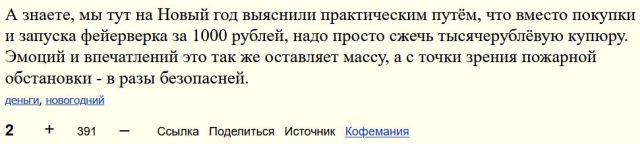 Кстати, о пожарах. На новогодних празднествах это второе по популярности развлечение, первое — прием спиртных напитков. Комбинация фейерверк + алкоголь при переизбытке того и другого выдают такую взрывоопасную (в прямом смысле слова) смесь, что становится не до шуток. Приём горячительного не способствует правильной установке наклона направляющих, и фейерверк летит куда угодно, только не в небо. Читал, что «правильно» запущенная петарда разбивает двойной стеклопакет, охотно верю и проверять на себе не хочу. Вам тоже не советую. Да, ещё чуть не забыл: на удивление многие ухитряются запускать фейерверк прямо дома возле праздничного стола, вот это штука реально убийственная. Но ведь запускают! Лень или уже сильно затруднительно дойти до двора дома — хороший повод сжечь квартиру. Зато такой праздник надолго запомнится всем в доме. Кроме тех, кто задохнется от дыма и не успеет выскочить, но это уже маленькие издержки большого праздника. Так что если не хотите себе такого «праздника», то последуйте мудрому совету выше и лучше посоревнуйтесь в сжигании купюр разного номинала. Это на порядок безопаснее, а эмоций от процесса ненамного меньше. Если вам наплевать на себя и окружающих, то хоть собачек пожалейте. Это же ужас, сколько их бегает по городу с выпученными глазами и волочащимися поводками после каждого Нового года. Новогодние салюты настолько пугают и дезориентируют собак, что они вырывают поводок из рук с бешеной энергией и могут очнуться в незнакомом месте уже только после нескольких километров пробега. И где потом зверюгу искать? «Вернется домой по своим следам» – миф, который редко работает в большом городе. Если собака крупная, то и жетон с номером телефона не всегда спасет, поди пойми, что у чужого пса на уме. Лучше не связываться и близко не подходить. Так что пытаться совместить просмотр салюта с выгулом собаки — плохая, очень плохая идея, собаководы со стажем в курсе. Хорошо, когда рядом лесопарк, да и то я бы не рисковал. Лучшее место выгула собаки в такие дни — под диваном у хозяина, а на улицу выводить пса ненадолго и строго по физиологическим нуждам. Возвращаясь к теме праздничных потерь. Насколько я помню, из документов быстрее и проще всего восстанавливается паспорт, как это ни парадоксально. В больших МФЦ обычно есть отдельное, надежно запирающееся помещение, что-то типа микрофилиала паспортного стола. Возьмите с собой загранпаспорт, пусть даже просроченный, это сразу снимает все вопросы вашей идентификации. Штраф с вас возьмут, не сомневайтесь. Не советуют настаивать на том, что паспорт у вас украли. Даже если его действительно украли, а не вы сами его потеряли в процессе отмечаний, то дополнительной мороки и писанины будет много, и не только вам, горячую симпатию паспортного стола вы себе обеспечите, а результат окажется таким же. Я сильно сомневаюсь в том, что вам удастся хотя бы увильнуть от штрафа, так что совет ИМХО разумный, даже если вам такое покажется обидным и несправедливым. И ещё. Боюсь, что в нынешние времена лучше не ждать доброго дядю, который паспорт найдёт, по его данным найдёт вас и предложит вам его выкупить за небольшое вознаграждение, а то и за символический «пузырь». Лучше чудес не ждать, а заявлять о потере паспорта сразу, а то можно ненароком вместо доброго дяди дождаться оформленного на этот пас