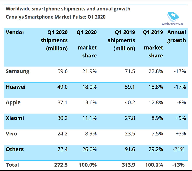 А вот дальше смотрим на топ-10 смартфонов по поставкам в каналы, это уже отчет, сделанный Canalys в этом мае.