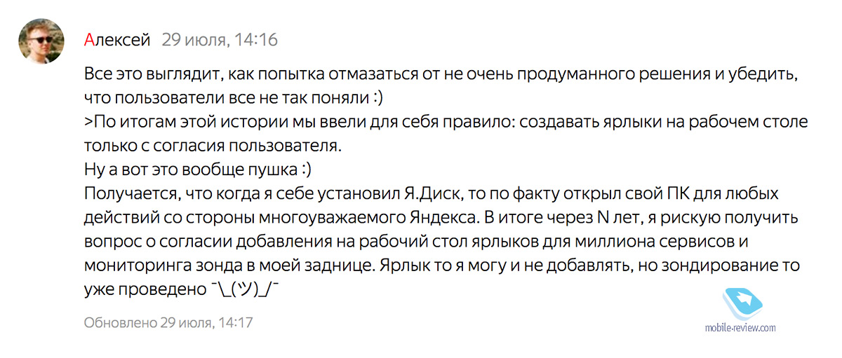 Юридически предъявить что-то "Яндексу" невозможно, компания может делать все что угодно, в том числе удалять ваши файлы. В 2013 году "Яндекс.Диск" удалял системную папку Windows, это происходило случайно. Думаю, что вопросов, почему это так, не должно возникать, равно как и почему "Яндекс.Диск" залезал туда (товарищ майор всегда был разборчив в том, что искать). Использую для работы "Яндекс.Диск", но никогда не ставлю его в виде приложения на компьютеры, только браузер и только на то время, когда загружаю файлы. Владимир Русинов, руководитель "Яндекс.Диска", решил защитить свое детище и выступил в корпоративном блоге. Объяснение смешное, хотели как лучше, получилось как всегда. Человек, отвечающий за продукт, утверждает, что удалить "Телемост" нельзя, а это как для MacOS, так и для Windows неправда, способ вынести папку приложения есть, и оно исчезает. Но больше всего мне понравились финальные слова: Владимир в "Яндексе" один отвечает за "Диск"? Кроме него нет никаких других людей, которые потенциально бывали в Интернете и знают, как он работает, что раздражает пользователей и вызывает однозначную реакцию? В 2020 году в "Яндексе" в очередной раз обещают создавать ярлыки на рабочем столе только с согласия пользователя! Аплодирую. Предусмотрительно не дано обещание не ставить ненужный софт без согласия человека, так как "Яндекс" продолжит это делать. Владимир вполне закономерно стал героем, и его панамка была быстро наполнена благодарными пользователями "Яндекс.Диска", читать комментарии одно удовольствие.