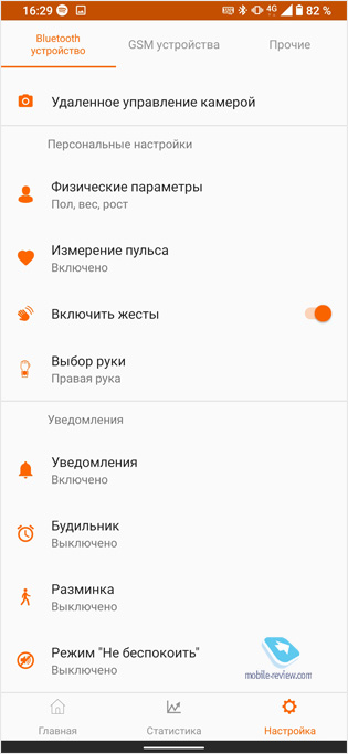 Возвращаемся на рабочий экран, нажав на верхнюю кнопку, так осуществляется переход на один экран назад. Свайп справа налево выведет список поступивших на часы уведомлений, его можно очистить, проведя пальцем справа налево и нажав на иконку с корзиной. Текст уведомления отображается, ответить на него с часов нельзя. В меню по свайпу слева направо находятся уже описанные функции (шаги, погода, пульс, тренировки, данные об отслеживании сна, настройки), а также будильник (включается в приложении), секундомер, управление музыкой, удалённая съёмка и поиск телефона. Последние два пункта работают лишь при наличии сопряжения со смартфоном. Что касается съёмки, то почему-то по умолчанию выбирается вспомогательный объектив, вариантов приложение не предлагает. Функциональные особенности, приложениеНажатие на нижнюю кнопку со стартового экрана переводит пользователя в меню со спортивными тренировками. Режимов немного, всего 6: прогулка, бег, беговая дорожка, велосипед, пеший туризм и плавание. Запуск каждого из них после 3 секунд отсчёта даёт старт записи данных, для каждой тренировки можно выставить цель по времени, пройденному расстоянию и сожженным калориям, можно заниматься и без этих параметров. После тренировки результаты отобразятся в соответствующем разделе в приложении. Результаты беговых тренировок можно отсюда же выгрузить в Strava, платформу, популярную среди любителей бега и велосипедных прогулок.