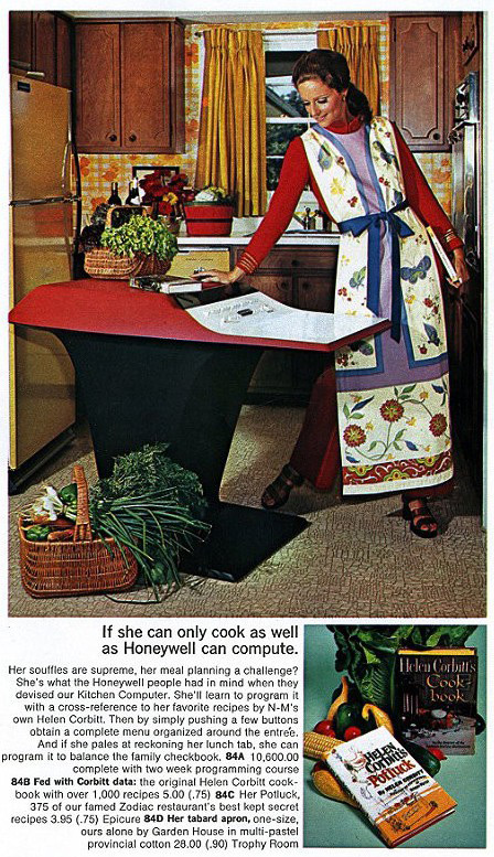 А вот реклама Honeywell, предлагающая кухонный компьютер за 10 000 долларов. Это была футуристическая фантазия, каким может быть компьютер. Если не поняли, то весь стол – это компьютер. На изгибе находятся кнопки для программирования. К компьютеру нужен ещё и принтер. По идее, в нем заложены всякие рецепты, и компьютер может выдавать полноценные меню. В продажу эта штука так и не поступила.
