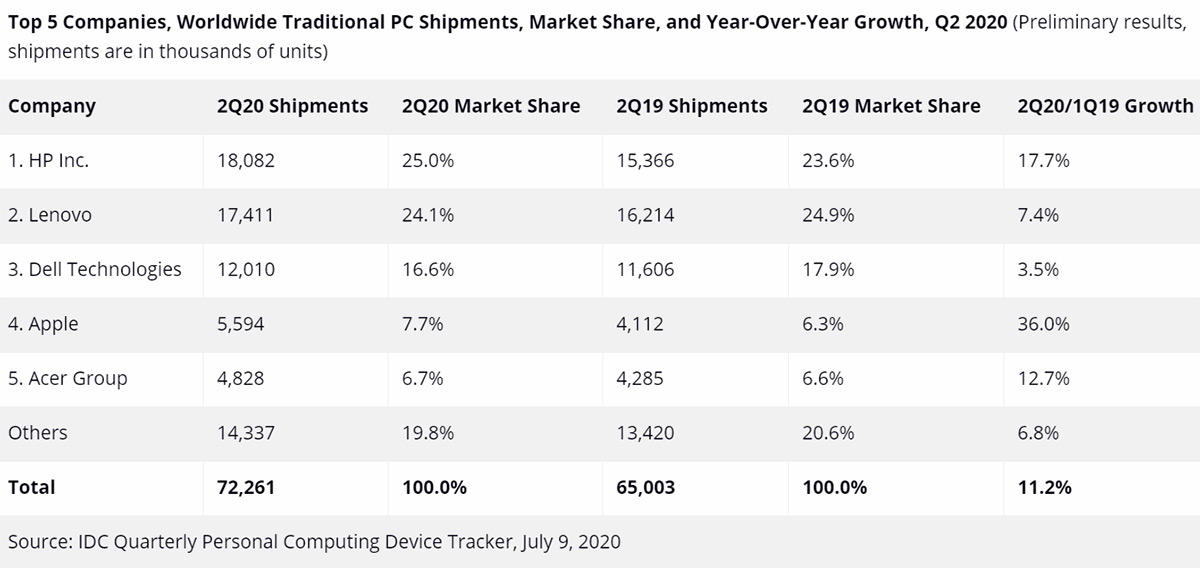 Буквально на днях Sony Group купила 1.4% в Epic Games за «космические» 250 миллионов долларов, что подразумевает общую стоимость студии в 18 млрд долларов. Столь мизерная доля означает, что Sony не сможет влиять на решения студии. Однако это позволит компании интегрировать в Fortnite промо своих фильмов, музыки и даже игр для PlayStation 5. Суть подобных интеграций в новые платформы для сторонних людей лишь в одном: мы вне контекста. Сначала это одна игра, потом ещё игра, потом какая-то новая платформа или приложение, а потом ты уже не понимаешь, что происходит. Полагаю, во время самоизоляционного карантина старшее поколение в Москве прочувствовало, как это – быть совсем вне контекста, когда для выхода из дома надо оформлять пропуск через интернет, а для покупки продуктов – заказывать курьеров. Будет забавно, если спустя лет 10 я не смогу оформить условный номерок к врачу, потому что для этого надо будет в каком-нибудь новом аналоге Fortnite зайти на такой-то уровень. Рост отгрузок MacBook на 36%Думаю, для вас не стало неожиданностью, что карантин способствовал росту продаж техники. Запертые в своих домах люди решили, что нужно обновить технику, так как она стала окном в мир. С этого праздника жизни ни один крупный производитель не ушел обиженным. HP, Dell, Apple и даже Acer получили двухзначный рост продаж по сравнению с аналогичным периодом прошлого года. Lenovo выросла чуть скромнее – 7.4%.