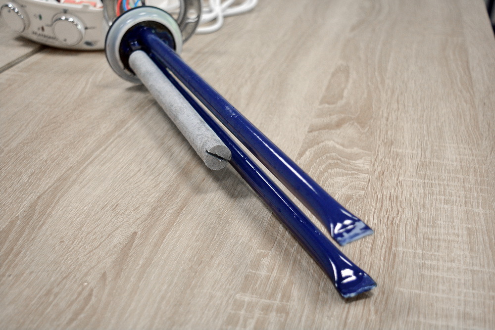 Мокрый ТЭН мощностью 2 кВт, трубка согнута в трех местах. Если распрямить ТЭН, получится шест примерно метровой высоты. Как мы помним, псевдосухие ТЭНы – суть те же мокрые, только в дополнительной защитной трубке. Вот и приходится производителям «изобретать» велосипед с двумя ТЭНами вместо одного. Для сравнения, у Atlantic сухие стеатитовые электронагреватели позволяют масштабировать конструкцию. И выпускать бойлеры со всего одним ТЭНом, но в версии с мощностью даже 3 кВт для 300-литровых бойлеров.