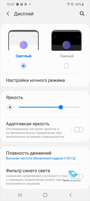В iPhone только одно разрешение экрана – 2436х1125 точек. Как результат, плотность картинки отличается, 463 ppi в iPhone и 566 ppi в Samsung. Яркость подсветки в обеих моделях одинакова в ручном режиме, в автоматическом она также сравнима. В Samsung есть алгоритм адаптивной настройки подсветки под ваши предпочтения, аппарат учится тому, как вам нравится, чтобы работал экран в разных условиях, запоминает ваши предпочтения. Эта опция в смартфонах Samsung есть несколько лет, и она постоянно эволюционирует, в iPhone ничего подобного нет, так как это очень технически отсталый продукт. Возможность настройки цветов на экране – насыщенные или естественные (второй вариант – аналог TrueTone, собственно, отсюда у Apple и появилась своя технология, она заимствована в Samsung).