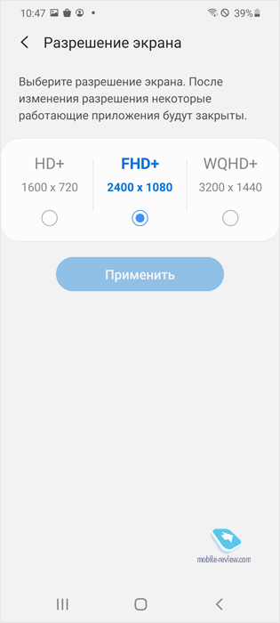 Теперь давайте посмотрим на другие ключевые характеристики экрана, например, разрешение. В Galaxy S20 поддерживается динамичное изменение разрешения – 1600х720, 2400х1080 (стоит по умолчанию) и, наконец, 3200х1440 точек.
