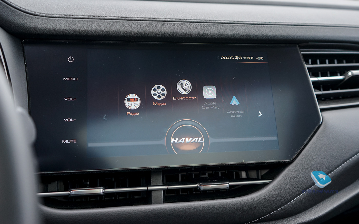 Электронных помощников в Haval F7 не сказать, чтобы много, но они есть, некоторые, правда, недоступны для модификаций для нашего рынка. Тестовый автомобиль был оборудован адаптивным круиз-контролем с системой предупреждения столкновений и экстренным торможением. Работает круиз неплохо, управлять им предлагается кнопками на руле, а на цветном 3.5" дисплее на приборной панели отображается визуальная информация по работе системы. Имеется в арсенале F7 и система предупреждения о возможном столкновении спереди, с визуальным и звуковым предупреждением. А также есть круговой обзор 360° с траекторными подсказками, который облегчает парковку. Качество картинки с камер не очень высокое и становится хуже при недостаточном освещении, например, на подземном паркинге, но все равно ориентироваться по ним можно. Единственный момент, что система кругового обзора, похоже, вынесена отдельно от медиасистемы, при её активации есть задержка около 3-4 секунд, плюс она вырубает полностью работу мультимедиа, очень странное решение. Система мониторинга слепых зон с визуальной индикацией, на нашем рынке недоступна, но остались плафоны ламп на корпусах зеркал в салоне. Недоступен также и джойстик для управления медиасистемой, хотя его наличие так и напрашивается, вместо него на центральном тоннеле стоит заглушка. Стоит, правда, сказать, что в кросс-купе Haval F7x джойстик есть. Центральный дисплей 9" сенсорный, развернут к водителю, он средний по качеству с невысоким разрешением, а на солнце бликует. Собственной навигации здесь нет, а иконки такое ощущение, что какие-то шаблонные, а не нарисованы специально для автомобиля. Зато есть поддержка Android Auto и Apple CarPlay, так что уже хорошо.