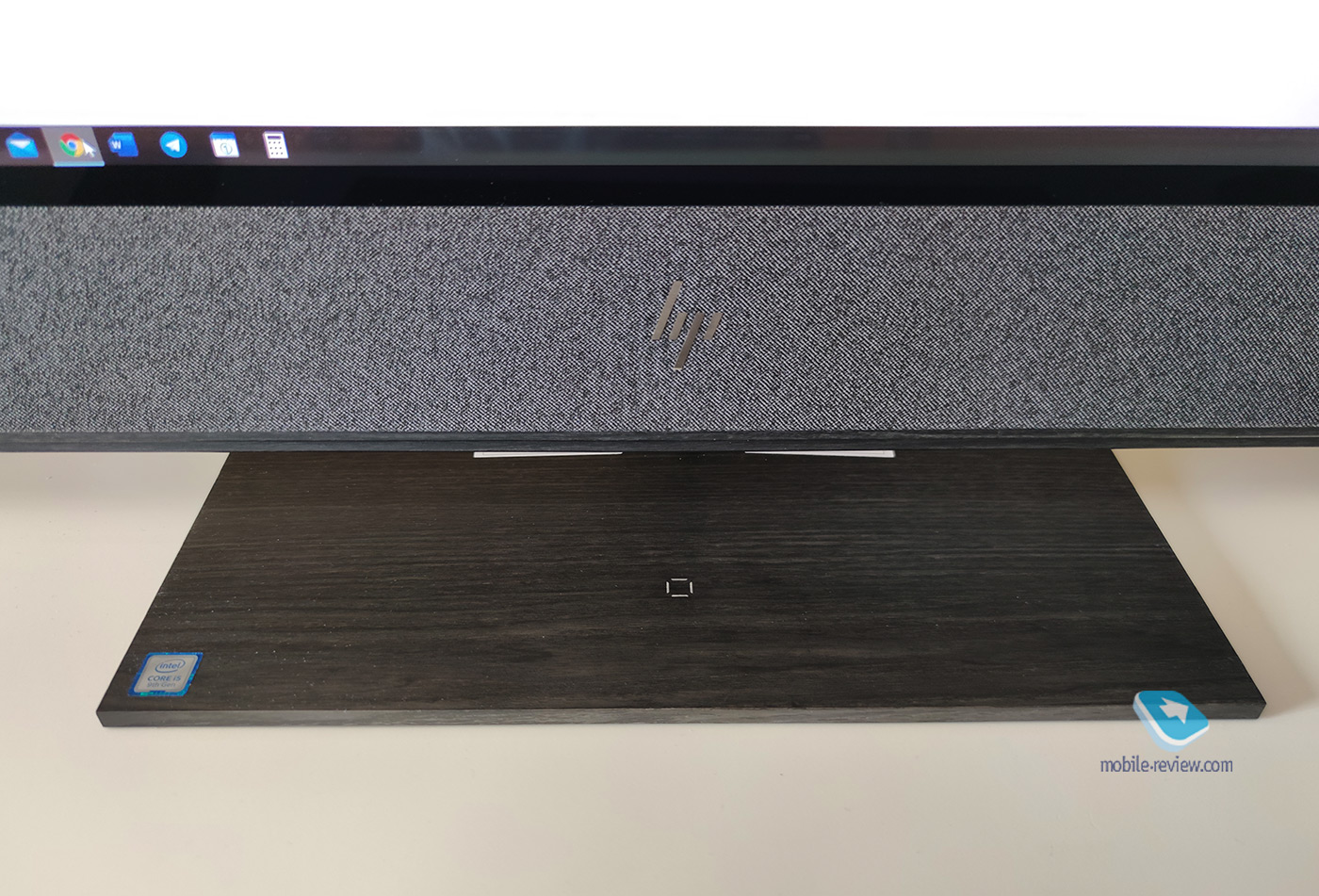 К динамикам прицеплена кожаная бирочка Bang & Olufsen Отдельных восторгов заслуживает ножка-подставка моноблока, выполненная под тёмный ясень. По центру ножки есть небольшой обозначенный палочками квадратик. Это зона беспроводной зарядки. Разумеется, площадка работает, даже если моноблок выключен. Кладешь свой смартфончик, и происходит магия! Это просто и гениально! Так должны делать все производители моноблоков.