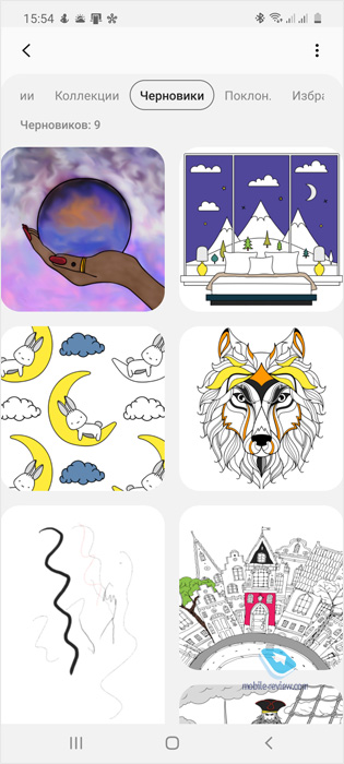 Первое время получал удовольствие, до тех пор, пока телефон сам не отклонил вызов из-за закрытой крышки во время разговора и плотного контакта телефона с ухом. Возможно, я что-то делаю не так, но после этого перешел на чехол попроще (фирма Wits) и пока не даю второго шанса. Отделение под карточки было очень удобным для пропуска на работе, но что поделать. Отзывы на официальном сайте говорят о том, что я не один в данном вопросе пострадал из-за сброшенных звонков. Что же такое S Pen? Раньше я думал, что это прихоть флагманов, и даже мечтал о подобном во времена Note 7-8, а вот теперь это есть в относительно бюджетном и свежем Samsung. По работе мне часто надо записать номер телефона или какую-то быструю напоминалку, стилус дает такую возможность. Можно, конечно, им вообще не пользоваться, но тогда смысл брать именно Note, когда есть S10 в Lite версии за те же деньги? Да, процессор Snapdragon, камеры немного разношерстные. Но как я понял, человек до меня также читал обзор Эльдара на тему Lite версий обоих смартфонов. Там камера S10 немного проиграла Note версии. Есть еще одна не очень проверенная история с использованием стилуса: включенные "быстрые команды" очень сильно жрут батарейку. Буквально 20 минут, и уже нет 20%. Кнопку на стилусе я не нажимаю. Если их выключить, то всего хватает надолго, спору нет. Самсунг уверял, что работает стилус до 10 часов, но конкретно на мой вопрос не ответил. Жене смартфон тоже понравился, но именно из-за стилуса: я как раз пишу эту статью, слушаю музыку с беспроводных наушников, а она раскрашивает на телефоне очередную картинку из приложения PenUP. Для сравнения, вот раскраска жены (все отрисовано стилусом) и мои кракозябры в общей галерее черновиков: