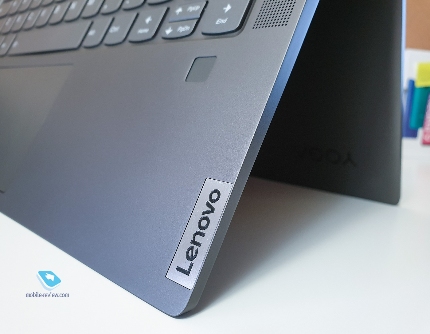 В дизайне минимум брендинга. На внешней крышке надпись Yoga, а на внутренней поверхности (где клавиатура) «бирка» Lenovo