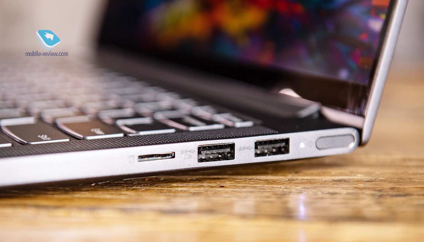 Из визуальных изменений со времён упомянутой модели IdeaPad я отметил для себя «похудевший» корпус, направленные вверх динамики, а также переехавший на правую боковую панель кнопку включения, которая объединена с дактилоскопическим сканером. Последний срабатывает очень быстро и корректно, процесс регистрации отпечатка похож на добавление пальца в Android, около минуты нужно прикладывать палец под разными углами. Многие отметят, что наличие кнопки включения/выключения в основном блоке клавиш может привести к случайному нажатию и последующему потраченному времени на повторное включение компьютера. Но для тестируемого устройства это неактуально. Кнопку-сканер по незнанию так просто и не заметить, рядом с ней мигает белый индикатор состояния, оттягивая на себя внимание. Кроме отпечатков пальцев, доступна аутентификация по лицу, это стандартная возможность Windows Hello. Экран, мультимедиаВ побывавшей на обзоре тестовой версии Lenovo Yoga Slim 7 установлен IPS-дисплей с достаточным запасом по яркости и глянцевым покрытием, в нашей рознице будет сделан акцент на модели с матовым покрытием, для многих этот аспект довольно важен. Но даже в глянцевом исполнении содержимое экрана читается уверенно. Геометрия экрана делает работу с текстом более удобной, контента помещается больше. Тонкие рамки вокруг экрана способствуют планомерному снижению габаритов таких устройств, не новая, но правильная тенденция.