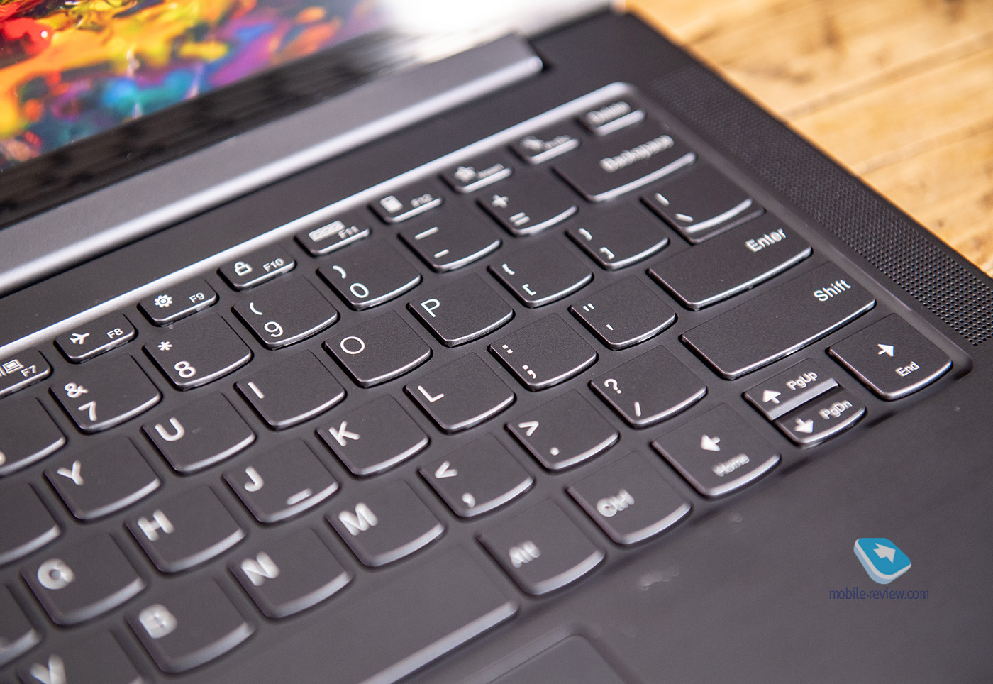 За звук отвечают два динамика с поддержкой Dolby Atmos, каждый по 2 ватта. Динамики направлены вверх, звучат громко и отчетливо, создаётся определённый объём звука. Громкости более чем достаточно для того, чтобы перекрыть шум вентиляторов системы охлаждения. Субъективно, я бы добавил низких частот, но в целом звуковая часть меня устроила, шумной вентиляции тут нет, так что ничто не помешает прослушиванию музыки и просмотру видео. Клавиатура, сенсорная панельМожно даже не смотреть на логотип производителя и легко угадать его по клавиатуре. Фирменный стиль Lenovo определяется безошибочно: чуть закругленные снизу клавиши, комбинация Fn+пробел для регулировки двух уровней подсветки и малюсенькие клавиши стрелок вверх и вниз сразу выдают почерк. Ход клавиатуры средний и тихий, размер клавиш достаточен для уверенного попадания по ним. Первое время при слепом вводе проскальзывали опечатки, пришлось сместить руки слегка вправо, сказалась привычка работы за клавиатурой основного компьютера.