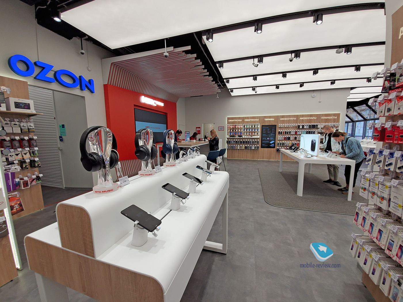 Смысловая составляющая этого плаката простая: точкой назначения для клиента является кофе, а МТС – просто то пространство, которое нужно пересечь. То, что маркетологи компании позволяют так вольно использовать бренд МТС, выглядит как минимум странно, это его обесценивает. Вспомнить примеры, чтобы другие операторы так использовали свою марку, не могу. Вернемся в магазин МТС. От входа вы видите яркую вывеску OZON, буквы синего цвета ярко светятся на стене. Это пункт выдачи товаров Ozon, самое популярное место в магазине, куда постоянно идут люди. За то время, что я осматривал магазин, в пункт выдачи прошло больше людей, чем было посетителей собственно флагмана МТС.