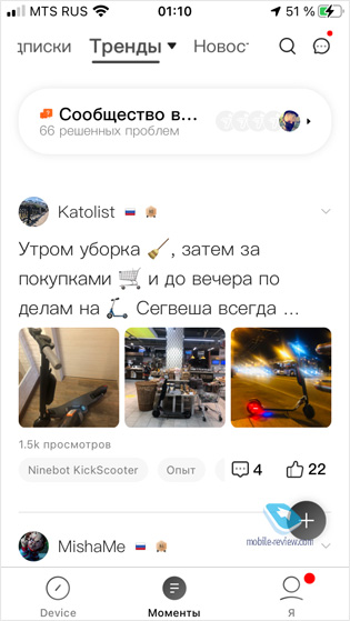 Заряжается батарея от относительно крупного сетевого адаптера (42В/1.7А), напоминающего зарядки для ноутбуков. С 0% до 50% батарея запитывается примерно 2 часа. С 50% до 80% – еще за 2 часа. Остальные проценты добираются еще за столько же. В целом, выходит около 5-6 часов. Особенно долго даются 95-100%. Приложения на смартфонеТак уж вышло, что основными устройствами у меня оказались смартфоны от Huawei и Honor. В их фирменном магазине приложения Segway-Ninebot не оказалось. Пришлось инсталлировать из аналогов. Первые пару дней не мог понять, почему самокат не коннектится с приложением. Оказалось, что есть две версии программ, а рабочая только та, что с рисунком глобуса на аватарке. Далее обнаружил, что Segway-Ninebot нуждается в Google-сервисах, коих нет ни в Huawei, ни в Honor. Хорошо, что под руку попался тот самый Apple iPhone SE первого поколения, о котором я писал вот тут. Основные важные вещи: процент заряда аккумулятора, оставшийся пробег, записи заездов с подробной информацией о скорости/расстоянии, обновление прошивки. Кроме того, в приложении можно заблокировать самокат – переднее колесо не будет двигаться. Конечно, можно унести, укатить на заднем колесе. Но далеко с 13 кг не убежишь.