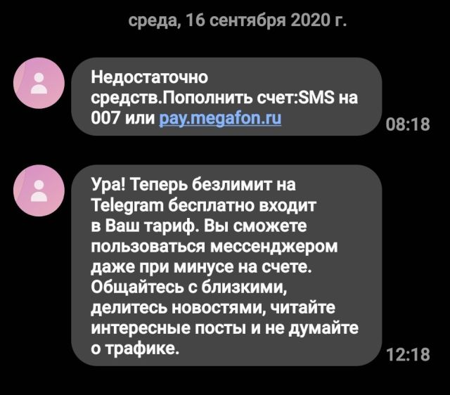 В «МегаФоне» тоже официально проснулись с некоторым опозданием, аж 16 сентября 2020 года, новость читаем здесь. Впрочем, я читал про то, что неофициально Telegram уже не тарифицируется некоторое время. Так или иначе, ситуация выправляется, и, наверное, совсем скоро всё станет хорошо у поклонников Telegram независимо от того, каким оператором они пользуются.