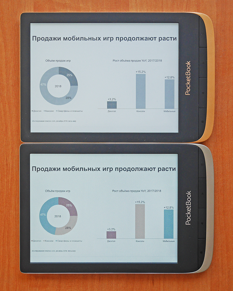 На днях я посмотрел обзор цветной модели PocketBook 633 Color от Эльдара Муртазина. К Эльдару отношусь с почтением, все же вырос я в том числе и на его статьях – как и многие из тех, кто, так или иначе, связал свою жизнь и профессию с гаджетами. Но в этом конкретном случае у меня возникло желание с главредом Mobile-Review.com подискутировать. Не выразить «фе», не высказать неприятие материала, а именно подискутировать. И публично озвучить свое мнение о цветных ридерах, о новом экране E Ink Kaleido, да и о модели PocketBook 633 Color как о носителе последнего. Благо этот ридер у меня на руках уже более месяца, как и практически все монохромные модели PocketBook. И я могу их сравнить предметно. Замечу, что этот мой материал опубликован с рекламной пометкой. Это действительно так – такова редакционная политика Mobile-Review, и я отношусь к ней с пониманием и уважением. Меж тем, рассуждать об E Ink Kaleido я могу только на примере PocketBook 633 Color, благо он уже давно у меня на руках, и я его от души потестировал. Других моделей с E Ink Kaleido я (пока!) не видел, хотя и слышал о них кое-что интересное – см. в самом конце. В общем, такие дела: пометка есть, но мысли – вполне себе искренние. И я готов их высказать хоть с пометкой, хоть без пометки – как угодно и на любой площадке. И доказать свои суждения с пруфами и фотками реального устройства. Но – ладно, ближе к делу. Вот, собственно, видеообзор Эльдара: Вот текстовая версия этого обзора: А вот то, что я имею сказать после просмотра. По пунктам. 1. По поводу качества отображения обычного текстаЯ согласен с Эльдаром, что экран E Ink Kaleido выглядит иначе, не так, как привычные всем монохромные дисплеи E Ink Carta. И, тем не менее, не могу не уточнить, что ситуация с дисплеем все же не такая критичная, как рассказывает в видео Эльдар. В частности, я бы выделил формулировки «буковки идут точечками» и «разрешение 100 ppi» – Эльдар Муртазин сообщает об этом, когда на экране ридера отображается именно обычный черный текст, а не какое-либо цветное изображение (к цветным картинкам и шрифтам я еще вернусь ниже). Фишка в том, что обычный черный текст на экране E Ink Kaleido, который применяется в PocketBook 633 Color, как раз отображается с разрешением 300 ppi. То есть с максимально высоким для дисплея. На фотографии ниже – цветной PocketBook 633 Color и монохромный PocketBook 632 (оба ридера есть у меня на руках).