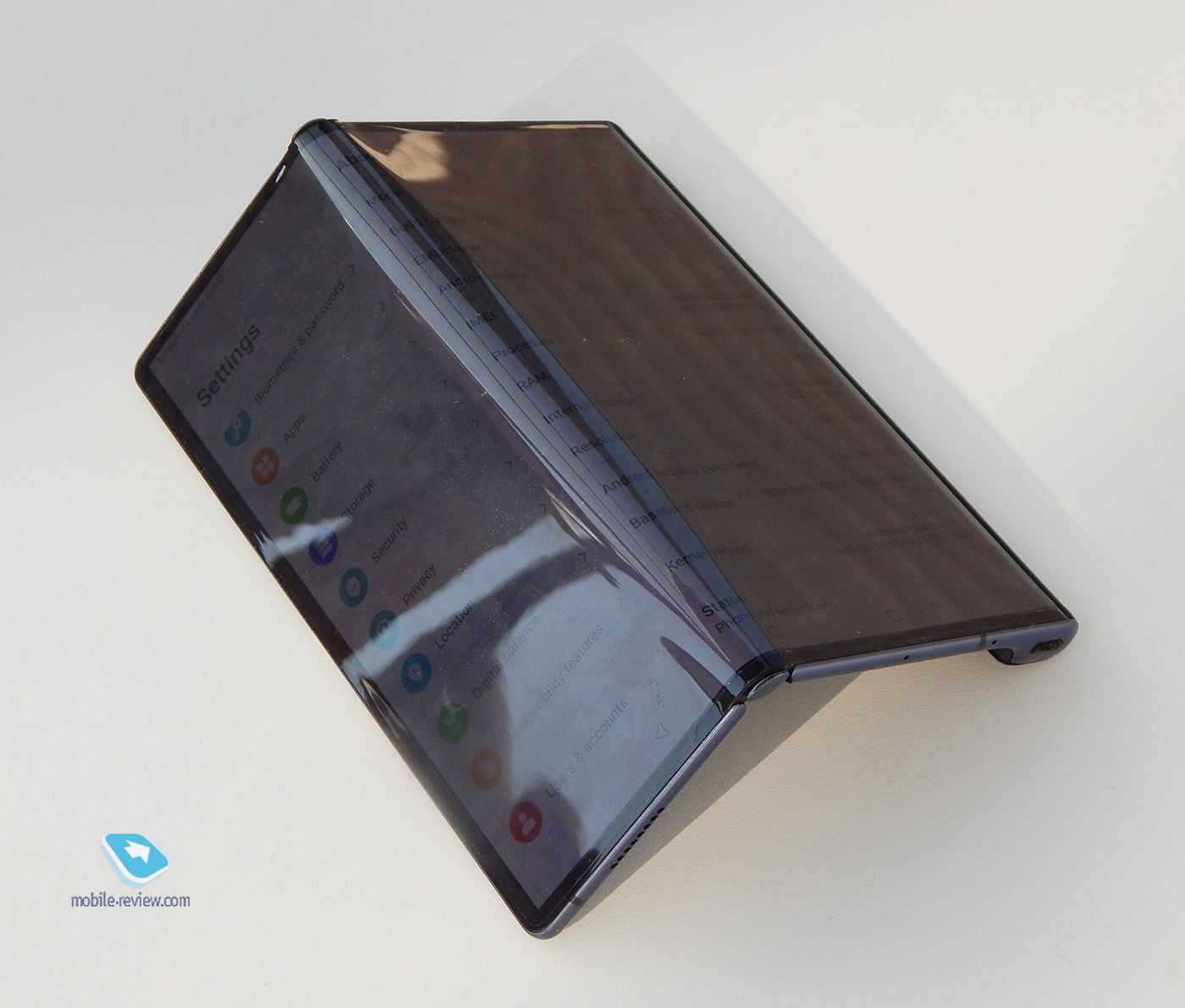 Открывается смартфон с заметным "пружинистым" эффектом, а закрывать его поначалу и вовсе страшно – экран заметно сопротивляется сгибанию. Возможно, так происходит из-за того, что в разложенном состоянии экран практически не образует заметной складки посередине. Она есть, но чтобы разглядеть её, нужно этого специально захотеть. При использовании её и вовсе не замечаешь. Защитная пленка якобы сделана из тройного слоя какой-то дорогущей разновидности полиамида, которая стоит в три раза дороже золота. Возможности проверить стоимость этого покрытия у меня не было, но тактильно – это такой же пластик, как и на других аппаратах со складным экраном. На ярком солнце экран тускнеет, но остается читаемым.