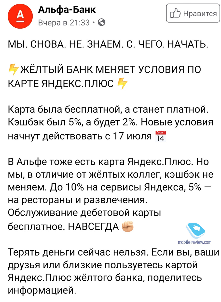 Субботний кофе №108Неделя выдалась неплохая на новости, особенно позитивные. Так Альфа-Банк, похоже, полностью поменял свой SMM-отдел и уже второй раз они палят по конкурентам, причём очень точно и с юмором. Так, недавно они прошлись по Сбербанку за спрятанные настройки включения системы быстрых платежей, а на неделе досталось Тинькофф Банку, за изменения в тарифах по кобрендинговой карте «Яндекс.Плюс». Интересно, это случаем не ребята из Рокетбанка туда пришли, а то последних почти неслышно.