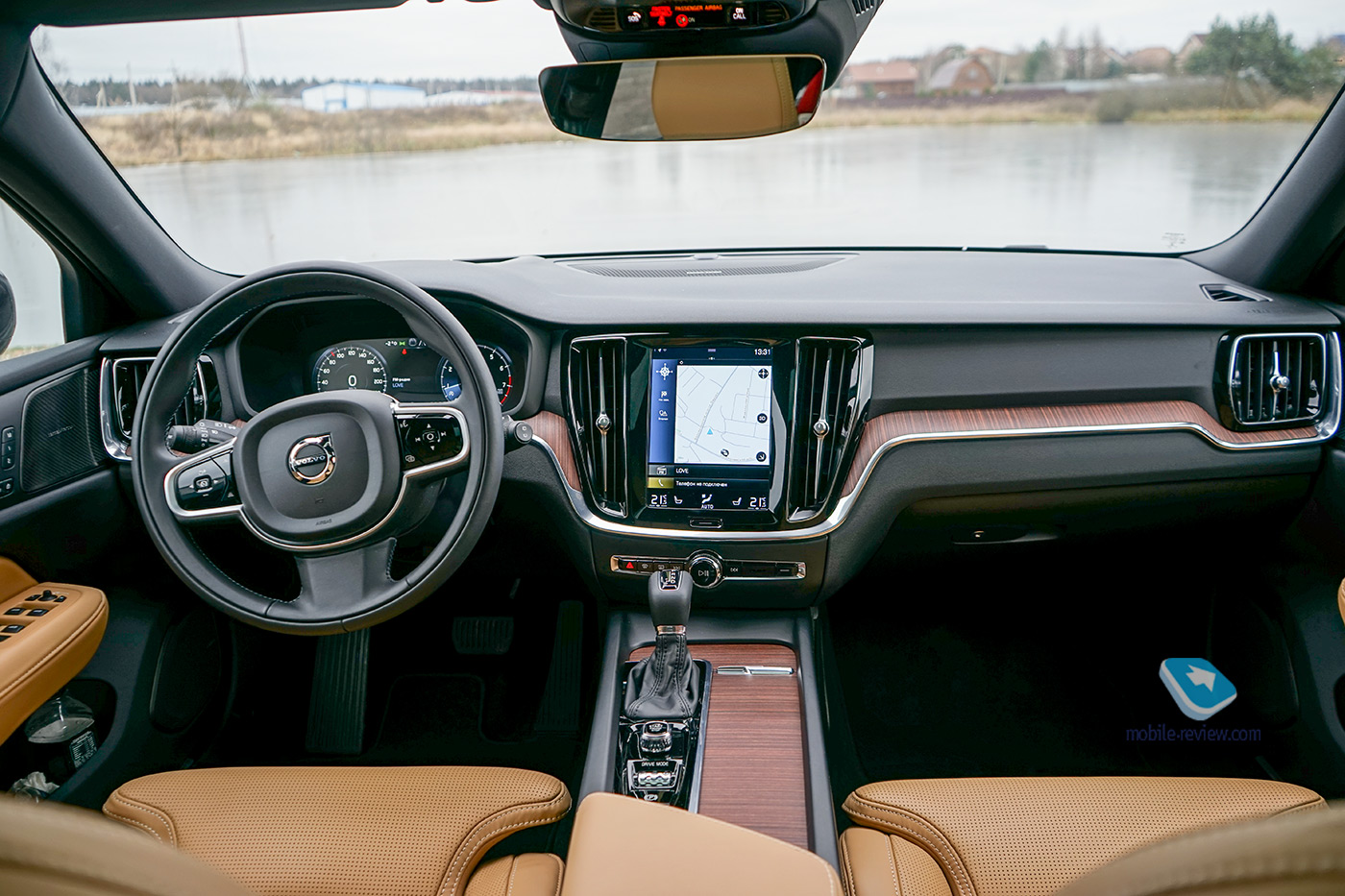 По салону V60 Cross Country – практически точная копия старшего брата, да в целом, наверно, 80% деталей соответствуют и другим современным моделям марки. Простая прямая панель, которую вдоль делит красивый изогнутый выступ с декоративными накладками, которые могут быть выполнены из разных материалов и представлены в нескольких цветовых решениях. На месте и фирменный дисплей медиасистемы с вертикальной ориентацией, повернутый немного к водителю, по бокам от которого находятся вытянутые воздуховоды. А также прямой тоннель с узнаваемым и довольно удобным рычагом АКПП, фирменной поворотной ручкой запуска двигателя и барабаном выбора режима движения. По сути, если вы сидели в других современных Volvo, то V60CC ничем не удивит, все стандартно аккуратно и практично. Мне салон шведских автомобилей симпатичен, есть в нем какой-то своё очарование, хотя понимаю, что найдется немало людей, которым он не по душе и которые найдут в нем для себя минусы.