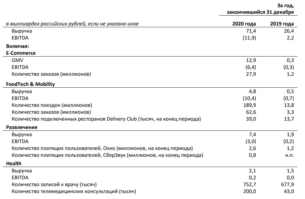 Во-первых, стоит сказать, что когда экосистема и активы полностью расписаны, то выглядит очень внушительно. Есть всё, включая «Союзмультфильм» (а я-то думал, откуда «Сбер» взял такую нелепую анимацию для своей Сберконф-презентации). Во-вторых, выручка составила 71.4 млрд рублей, а EBITDA – минус 11.9 млрд. Тут, конечно, напрашивается сравнение с «Яндексом», если собрать из его отчетности все цифры за 2020 год, то получится, что EBITDA сервисной составляющей (такси, каршеринг, «Яндекс.Плюс», «Кинопоиск HD», «Яндекс.Еда», Edadeal и т.д.) – убыток 10.5 млрд рублей.