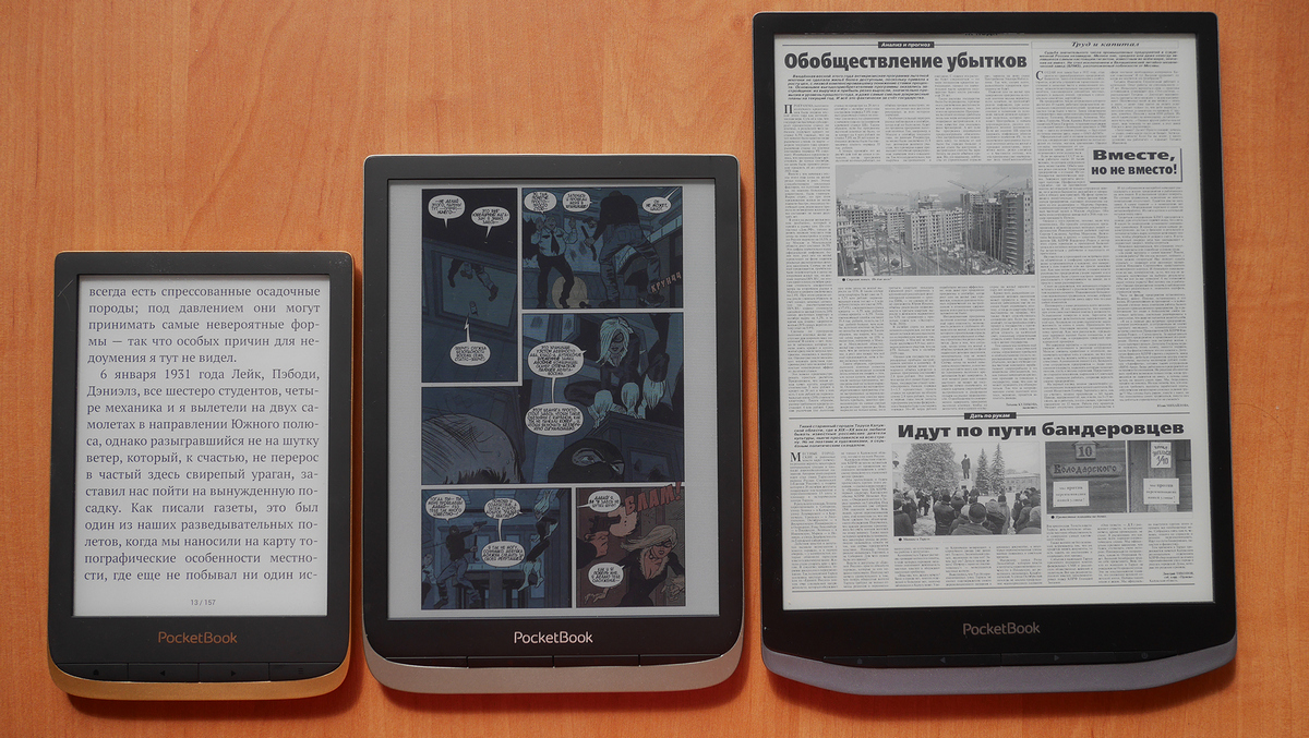 Безусловно, на экранах 10,3-дюймовых ридеров вроде PocketBook X контент всех перечисленных типов будет выглядеть еще крупнее. И его, наверное, еще комфортнее будет изучать. Но! Стоит помнить, что пока 10,3-дюймовых цветных ридеров не существует – они бывают только черно-белыми. Кроме того, такие модели очень крупные – как условный iPad. И поэтому просто в силу габаритов «гигаридеры» (назовем их так) не являются универсальными решениями. Это специфические продукты, необходимые для совершенно конкретных задач. Например, для изучения каких-то архиектурных проектов, ну или для чтения электронных газет. Словом, покупать такое устройство стоит только в том случае, если вы точно знаете, зачем оно вам.