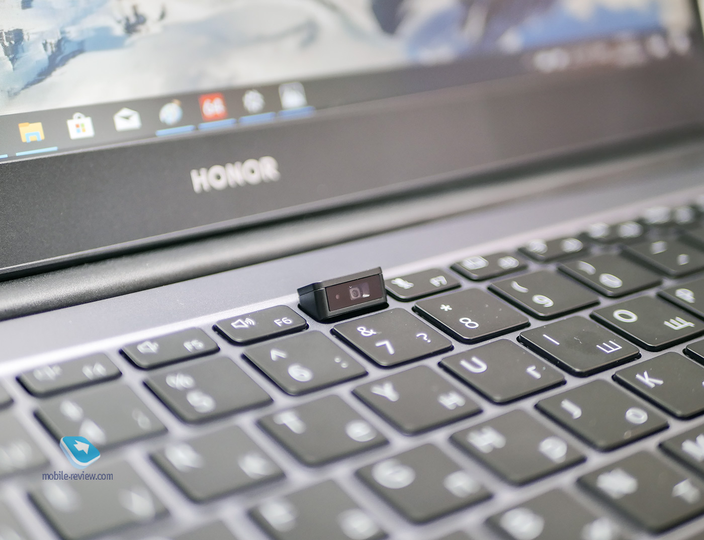 При касаниях и нажатиях тачпад не люфтит – хорошо. Кнопка питания, совмещенная со сканером отпечатков пальцев, находится справа вверху, причем отдельно от клавиатуры. Выглядит несколько странно: одинокая кнопка на пустом месте. В MB15 смотрится еще глупее :) При старте Windows не надо вводить пароль – просто нужно коснуться кнопки включения. Такая же фишка и у MagicBook Pro. Работает под любым углом.