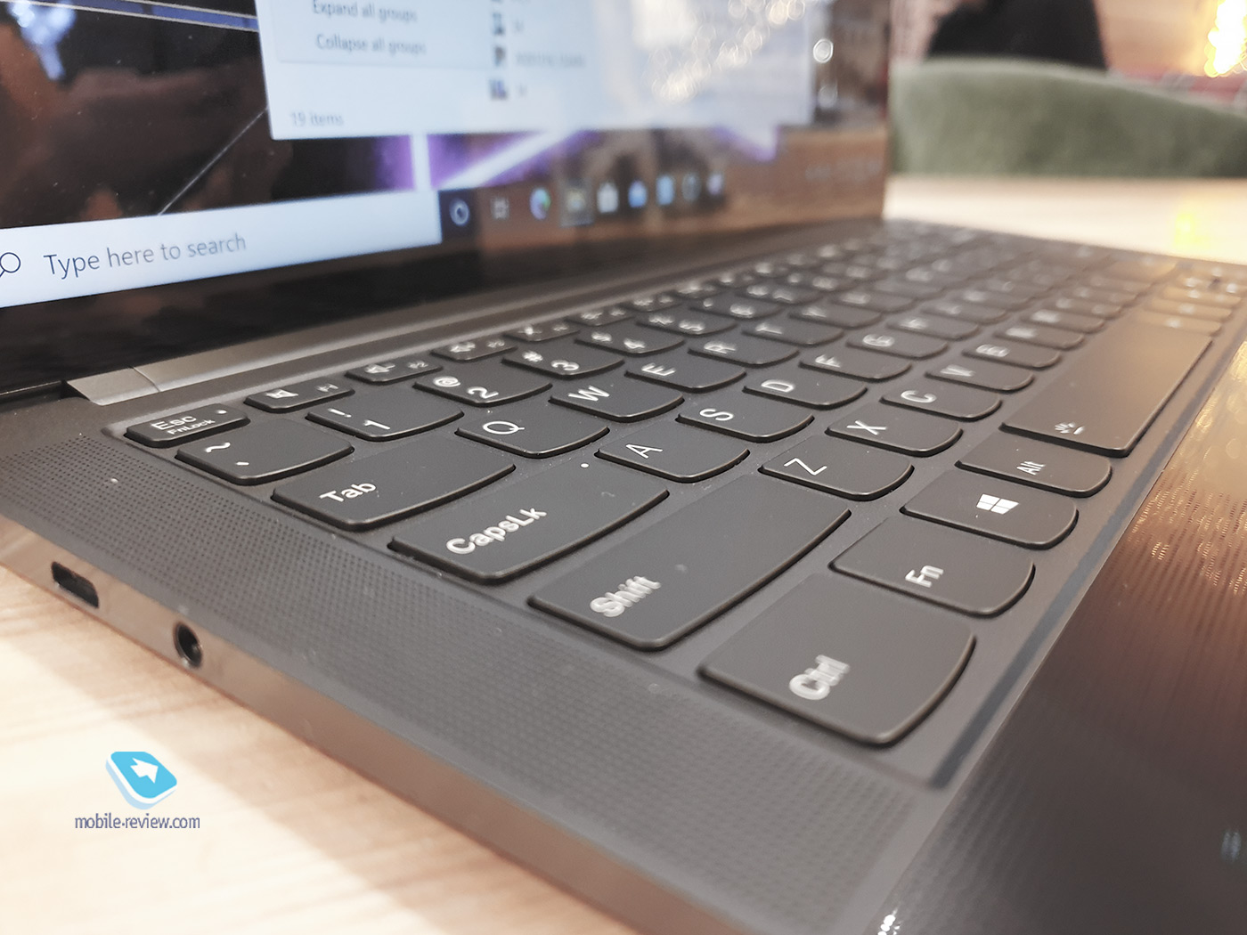 В ноутбуке есть веб-камера. Уж не знаю, с чего, но мне почему-то кажется, что при цене в 190 тысяч рублей веб-камера должна снимать не хуже, чем iPhone. А снимает она вот так, что, на самом деле, очень хорошее качество по меркам ноутбуков. Просто Next-Gen! Используя переключатель на боковой поверхности, камеру можно полностью отключить. Windows просто перестанет её видеть. Камера не снабжена защитной шторкой, так как есть физический переключатель. И это, безусловно, лучше, потому что шторка обычно лишь прикрывает изображение, при этом звук остаётся. Клавиатура и тачпадКлавиатура Yoga Slim 9i примечательна тем, что у неё укороченный ход и она практически бесшумная. Сразу отмечу, что на экране отпечатки клавиатуры не остаются. Клавиши с минимальным ходом, но чуткие. После обычной клавиатуры тут требуется время, чтобы привыкнуть, так как нужно гораздо меньшее усилие, иначе будете барабанить и подушечки пальцев устанут. Настоятельно рекомендую попробовать клавиатуру перед покупкой.