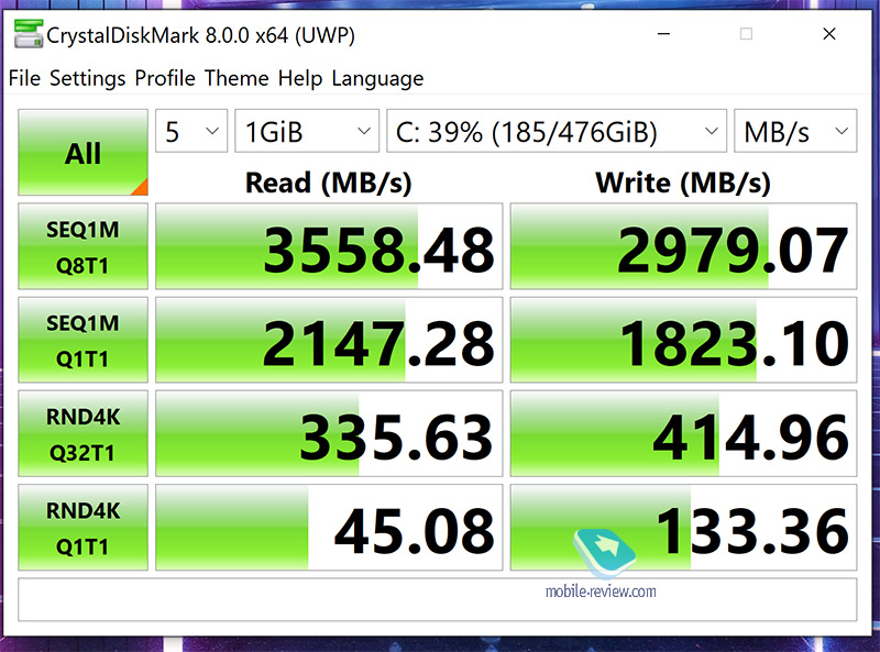 Пожалуй, главное, что можно сказать о производительности ноутбука, – это то, что он быстрый (загрузка системы за 7 секунд) и бесшумный. Даже под максимальной нагрузкой, вызванной синтетическими тестами, уровень шума не поднимался выше 45 дБ. Попутно важно отметить, что ноутбук оставался холодным. Даже во время стресс-тестов и бенчмарков температура CPU не превышала 85 градусов. Типичная температура – это 60-70 градусов. Время автономной работыВремя автономной работы – это сильная сторона ноутбука. Особенно если выберете модель с Full HD экраном, которая, как обещают, может продержаться до 20 часов на одном заряде. У меня был образец с экраном 4К. Тут важно отметить, что время автономной работы очень зависит от яркости экрана. 500-нитовый экран – это значительный потребитель энергии. Например, на максимальной яркости ноутбук может продержаться 7.5 часов в режиме офисной производительности. И это отличный результат, так как скорее глаза вытекут, чем 8 часов кряду просидишь за экраном на максимальной яркости. А вот если выставить экран на 50% яркости (это 250 нит, в целом среднестатистическая яркость для ноутбуков), то можно получить 11 часов работы.