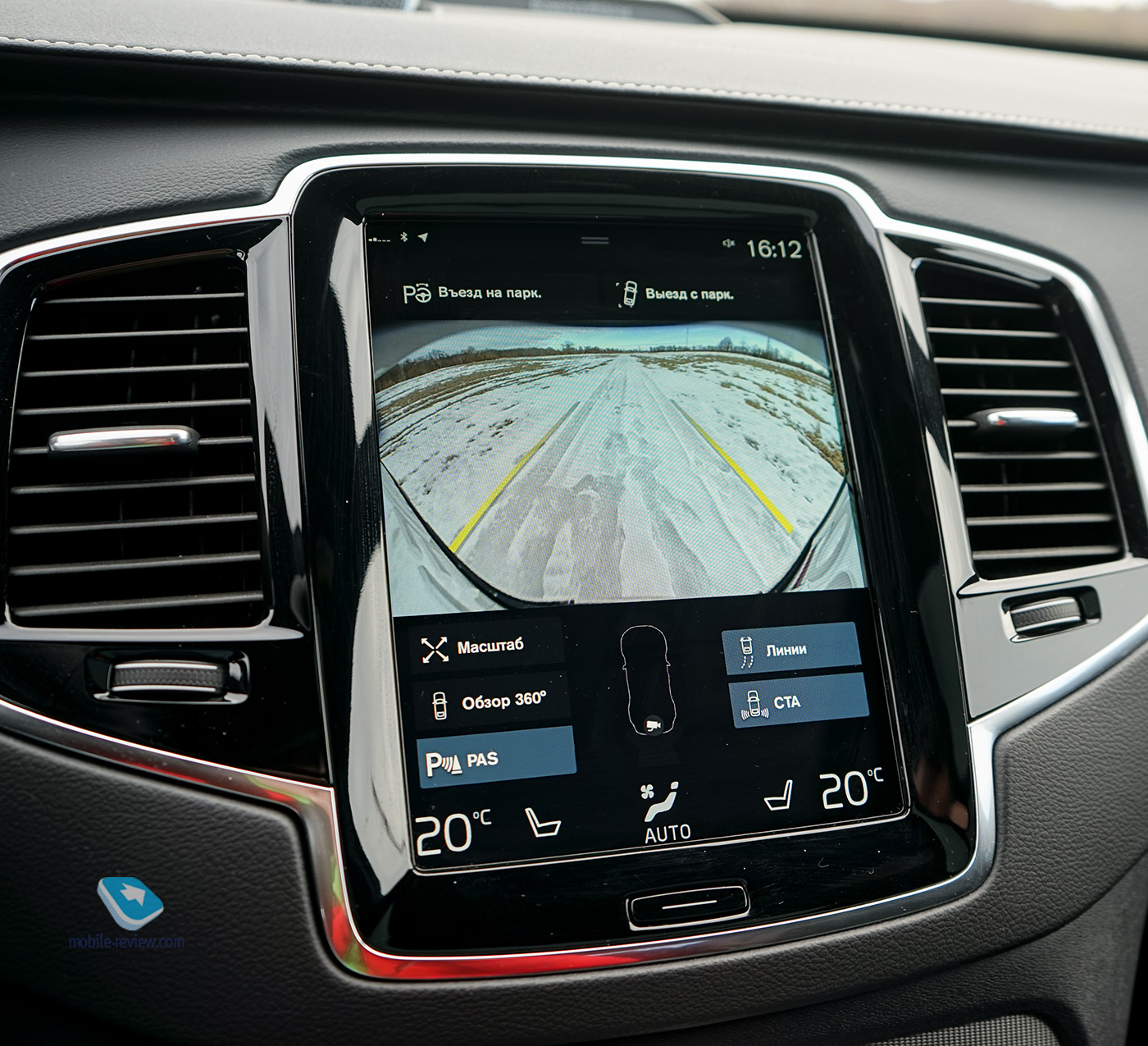 Электронных помощников водителя в нашем тестовом автомобиле был полный набор. Отмечу отличную картинку с камер кругового обзора, благодаря чему парковаться даже в самых сложных местах становится значительно легче, и систему мониторинга слепых зон с визуальной индикацией в зеркалах, хотя крупные зеркала XC90 позволяют и без неё хорошо ориентироваться. А также систему предупреждения при движении задним ходом, которая позволяет избежать столкновения с перпендикулярно идущим транспортом. И, конечно, стоит отметить систему Pilot Assist, которая позволяет автомобилю двигаться практически в автономном режиме, неважно, в пробке или на трассе. Система хорошо реагирует на обстановку, плавно замедляя и ускоряя автомобиль, но при этом всегда держась в потоке. Всё управление лежит на кнопках на руле, они выглядят плоскими, но благодаря крупным размерам ими легко управлять даже вслепую. Помощник позволяет на 10 секунд отпустить руль, но после этого попросит вас положить руки обратно на рулевое колесо. Правда, на трассе столкнулся с тем, что Pilot Assist периодически переключался на адаптивный круиз-контроль, видимо, из-за того, что не видел разметку, которая практически исчезла вместе со снегом. А системы ведения за впереди идущим автомобилем в Volvo нет, ориентируется автопилот только на дорожную разметку.