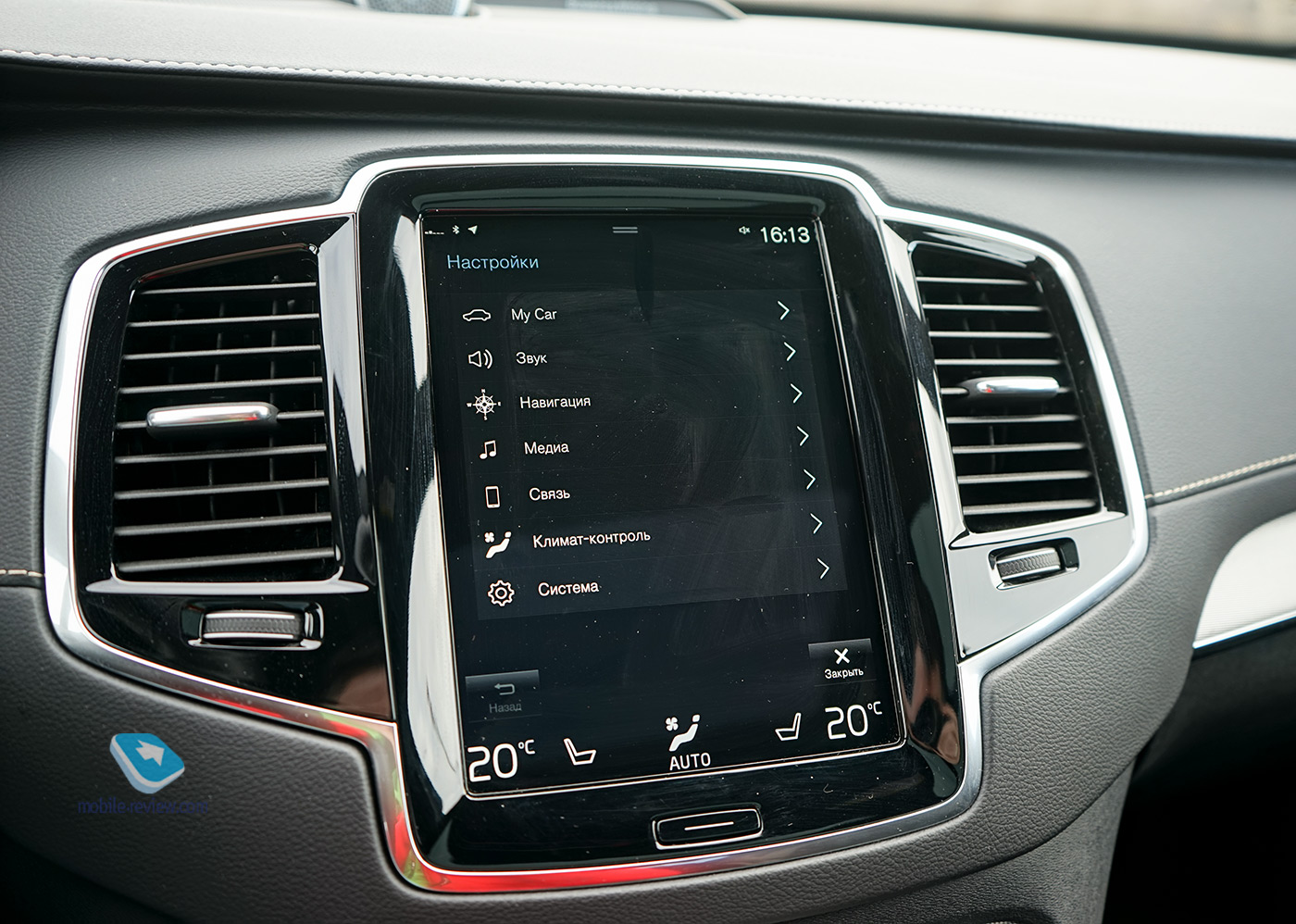 В XC90 установлена медиасистема Sensus с 9” сенсорным экраном с вертикальной ориентацией. Дисплей неплох по качеству, отзывчив, но вот разрешение экрана уже хотелось бы и повыше. Правда, в текущем поколении апгрейда системы мы не дождемся. В новом электрическом Volvo XC40 Recharge компания установила абсолютно новую систему на базе ОС Android, разработанную в сотрудничестве с Google. В прошлом месяце повилась информация, что и XC60 2022-го модельного года, также будет комплектоваться ей. А вот XC90, похоже, получит обновленную систему только со сменой поколения.