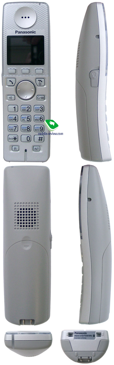 Трубка аппарата выполнена из пластика серебристого и светло-серого цветов, на задней панели пластик слегка шершавый, он используется для всех телефонов марки. Корпус имеет плавное скругление задней панели, за счет чего удобно лежит в руке – это фирменная черта телефонов Panasonic. Верхняя часть лицевой панели имеет гладкую полупрозрачную поверхность, под нее нанесен геометрический рисунок; подобное решение применяется для всей панели более дорогих аппаратов «девятой» серии и выглядит довольно любопытно, во многом за счет своей новизны. Дизайн аппарата можно охарактеризовать как классический и довольно строгий, особенно это касается серебристого цветового решения. Картину немного разбавляет кругляш четырехпозиционной клавиши и «шашечки» верхней части лицевой панели. Качество изготовления корпуса находится на достойном уровне, все детали точно подогнаны, ширина зазоров равномерна и минимальна, дефекты литья отсутствуют – даже скучно. Лицевая панель трубки содержит отверстие динамика, помещенное в специальное углубление, дисплей, три функциональные клавиши, четырехпозиционную клавишу и цифровой блок. На левую боковую панель помещен разъем для гарнитуры, на нижнем торце находятся контакты для зарядки аккумулятора телефона. Задняя панель содержит крышку аккумуляторного отсека и отверстия динамика громкой связи, здесь нет ничего необычного. На верхний торец конструкторы поместили оранжевый светодиод, он реагирует на различные режимы работы устройства и сигнализирует о наличии входящего вызова. УправлениеСхема управления телефоном типична для нового семейства и напоминает таковые сразу у нескольких новых моделей, чьи обзоры уже появились на нашем сайте, ссылки на них размещены в конце страницы.