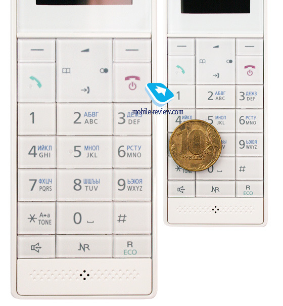 Еще один интересный момент в аппарате — поддержка дополнительных брелоков-искателей. К сожалению, они не входят в комплект, их предполагается покупать отдельно. Прочие функции стандартны: эко-режим, «расширенный» автоответчик, автоопределитель номера, радионяня – то есть все то, что можно найти почти во всех моделях других производителей. Внешний вид, управляющие элементыДизайн трубки несколько противоречив, но достаточно привлекателен. Трубку попробовали сделать не привычных гладких форм, идущих от эпохи биодизайна, а несколько более угловатой. В результате ее тыльная сторона сочетает плавные перетекающие изгибы и довольно острые грани. Передняя же часть как бы срезана под прямым углом. Вокруг экрана белый пластик прикрыт прозрачной панелью, ниже идет полуматовый блок клавиатуры, а еще ниже – матовая белая панелька, прикрывающая микрофон. Единственный логотип разместился между экраном и разговорным динамиком, дизайн которого полностью заимствован у предыдущего поколения DECT-телефонов от Panasonic.