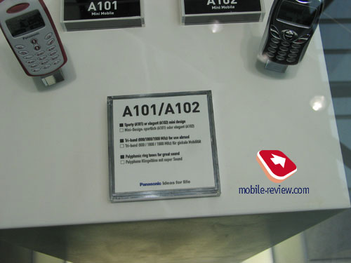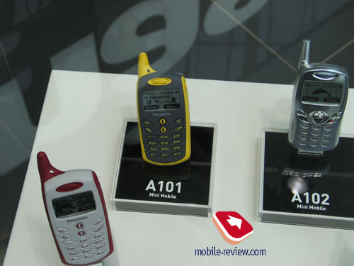 Основной тренд от Panasonic – это Mini Mobiles (миниатюрные телефоны). На выставке были представлены модели A100, A101, A102. A100 – самый простой в серии, будет доступен в трех цветовых решениях (черный, красный голубой), полифония, трех-диапазонный, записная книжка на 250 номеров. A101 – спортивный дизайн, функционально ничем от A100 не отличается. Модель A102 тоже отличается от A100 только дизайном.